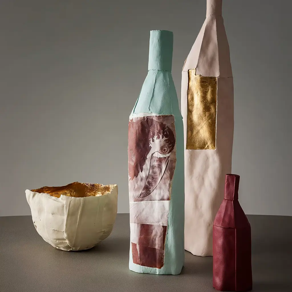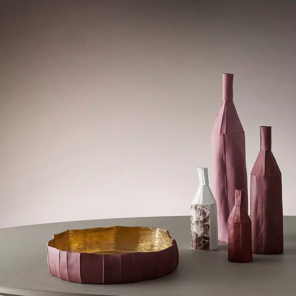 Striking in its simplicity, this one-of-a-kind handmade bottle will be a splendid centerpiece into any modern or traditional decor. A piece of functional decor, it is superbly handmade of paper clay, a material that combines fibers and paper pulp into the ceramics mix to create unique textures of strong tactile quality. Every one of Paola Paronetto’s creations is unique. Slight variations in shape, colour and size are to be considered a guarantee of authenticity and value. They are finished with non-toxic satin-finish enamels. Although very rarely, it is possible for them to leak after long periods of exposure to water. It is therefore advisable to test their water resistance before using them on delicate surfaces. They should not be used as dining utensils. The white pieces can be washed with water or sanitizing products, whereas the coloured pieces must be treated more gently and cleaned with a feather duster or a soft cloth, dry or moistened very slightly with water.