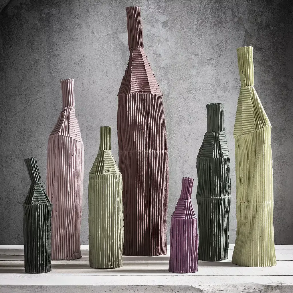 With its delicate mauve color and unique surface, this vase will add a bold statement to any décor. Handcrafted of paper clay using a long and complex process to achieve its distinctive crumpled texture, this contemporary sculpture features a classic bottle shape with a slender body and tapered, asymmetric neck. The unique ridges on its surface, vertical on the body and vertical-horizontal on the faceted neck, add a dynamic quality making this eye-catching piece a visual favorite on a console or on a side table. Every one of Paola Paronetto’s creations is unique. Slight variations in shape, colour and size are to be considered a guarantee of authenticity and value. They are finished with non-toxic satin-finish enamels. Although very rarely, it is possible for them to leak after long periods of exposure to water. It is therefore advisable to test their water resistance before using them on delicate surfaces. They should not be used as dining utensils. The white pieces can be washed with water or sanitizing products, whereas the coloured pieces must be treated more gently and cleaned with a feather duster or a soft cloth, dry or moistened very slightly with water.