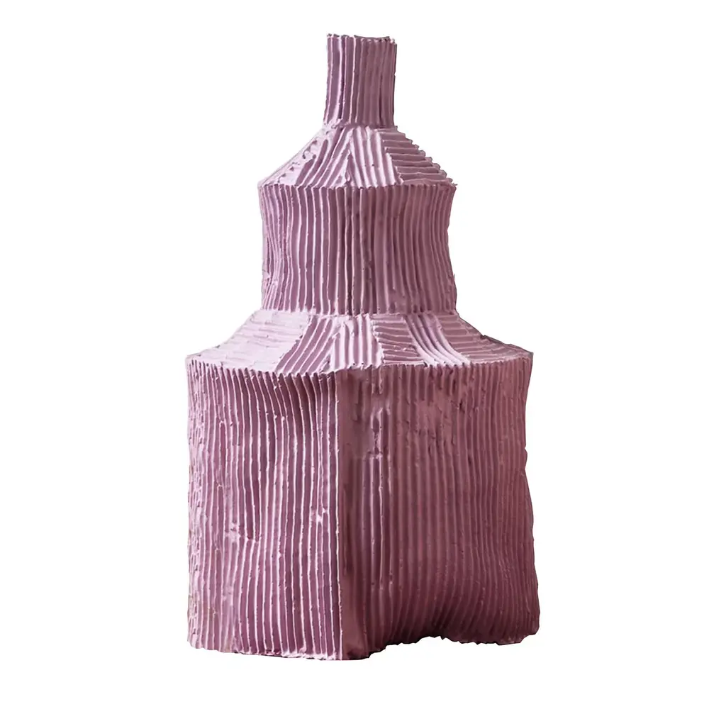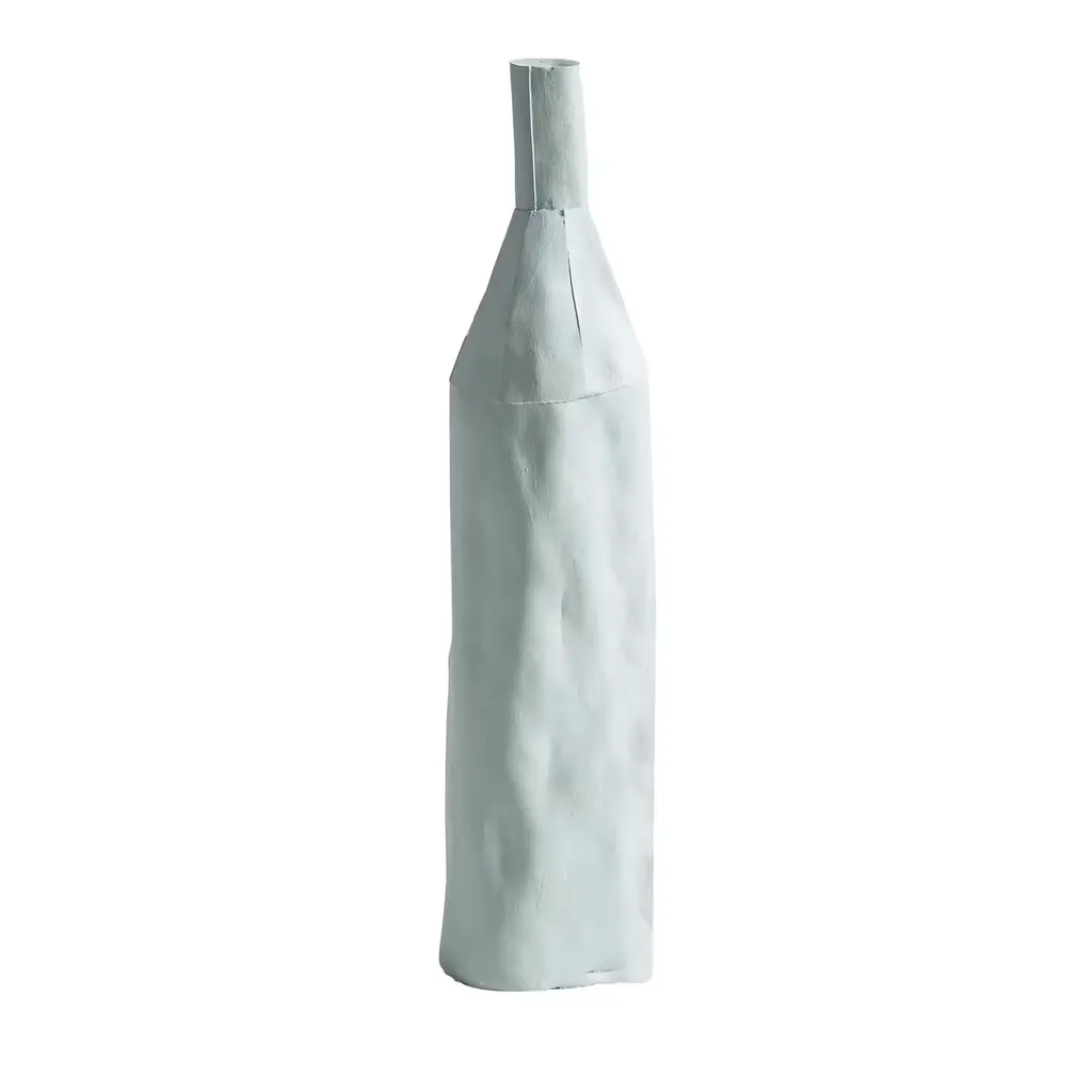 The seemingly simple form of this sculpture evokes conflicting sensations: sinuous and linear, stable and precarious. This handmade bottle boasts a minimal design with a slender, cylindrical body and detailed vertical ridges that add depth and movement to the piece. A black rectangle with a smooth finish is placed below the faceted, asymmetrical neck, accented with horizontal lines. Entirely handcrafted of paper clay, this object will bring an elegant accent in any space in the home or office. Every one of Paola Paronetto’s creations is unique. Slight variations in shape, colour and size are to be considered a guarantee of authenticity and value. They are finished with non-toxic satin-finish enamels. Although very rarely, it is possible for them to leak after long periods of exposure to water. It is therefore advisable to test their water resistance before using them on delicate surfaces. They should not be used as dining utensils. The white pieces can be washed with water or sanitizing products, whereas the coloured pieces must be treated more gently and cleaned with a feather duster or a soft cloth, dry or moistened very slightly with water.