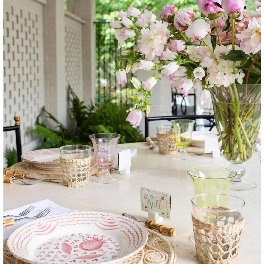 A new take on an old tradition! These off dusty pink and white hand painted plates, with flowers and vines, are inspired by beautiful antique Portuguese Talevera. Use them daily or save them for special get togethers.