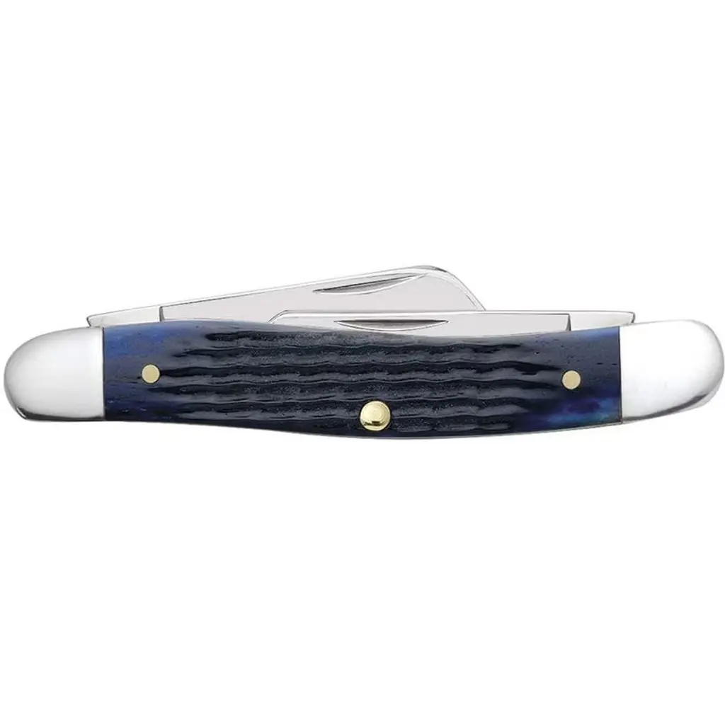 The Medium Stockman knife from the Blue Bone Family is a reliable and stylish tool, reflecting the steadfast qualities of a "true blue" friend. It features classic blue handles that gain more character with prolonged use, symbolizing dependability and strength. This practical pocket knife measures 3.63 inches when closed and weighs 2.5 ounces, making it an ideal size for everyday carry. The Medium Stockman is equipped with three blades: a Clip blade for multipurpose use and detailed work, a Sheepfoot blade designed for added strength at the point, ideal for carving and clean cuts, and a Spey blade for all-purpose utility. Each blade is made from mirror-polished Tru-Sharp surgical stainless steel, a high-carbon material known for its ability to retain a sharp edge longer than conventional steel, as well as for its exceptional strength and corrosion resistance. The knife's handle features a Rogers corn cob jig Blue Bone finish, adding to its visual appeal. Made in Bradford, PA, USA, with both domestic and imported materials, the knife is packaged in a box, ready for both use and collection. The Medium Stockman knife is more than just a tool; it's a symbol of trustworthiness and enduring quality in the Blue Bone Family.