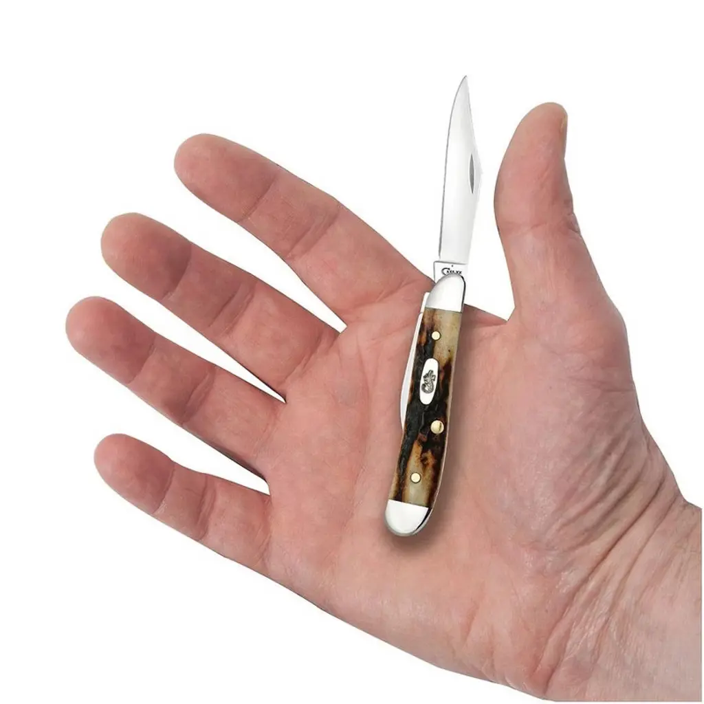 The Peanut knife, a cherished part of the Red Stag Family, is a favorite among Case enthusiasts for its unique blend of tradition and craftsmanship. This knife features a handle made from Genuine India Stag, achieved through an age-old process that gives each knife its own distinct character and texture. The Red Stag handle not only adds to the knife's visual appeal but also ensures a comfortable and secure grip. With its petite size, measuring 2.88 inches when closed and weighing just 1.2 ounces, the Peanut fits discretely and conveniently in a pocket. This folding knife is equipped with two full-length blades: a Clip blade, commonly used as a multi-purpose blade preferred for detail work, and a Pen blade, ideal for light work. Both blades are crafted from mirror-polished Tru-Sharp surgical stainless steel, known for its high-carbon composition that ensures prolonged edge retention, extraordinary blade strength, and corrosion resistance. Made in Bradford, PA, USA, using both domestic and imported materials, the Peanut comes packaged in a box. The Peanut in Red Stag is more than a knife; it's a compact and durable tool, embodying the artistry and quality of Case knives.