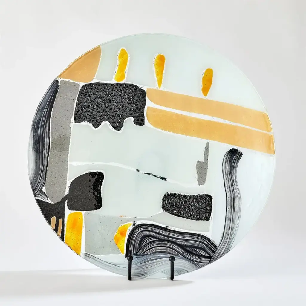 The Cashmere Glass Collection is a testament to the intricate artistry of Portuguese artisans. The process begins with a flat piece of clear glass, which is carefully cut into the shape it will become. The number of colors in the collection determines the number of templates used to layer the sand onto the glass. Artisans start by placing the first template onto the glass and sifting sand through it to fill the template with a specific color. With precision, the template is then lifted and removed. Another template is placed onto the clear glass to sift a different color of sand, creating the next shape. This process is repeated until the flat glass is nearly covered with different colors of sand. Next, artisans lay a clean piece of clear glass on top, creating a sandwich, and carefully transport it to the kiln where it rests upon the shape it will become. In the kiln, it undergoes baking at an incredibly high temperature, fusing the two layers of glass together to create exquisite abstract designs. Plate stands are sold separately from chargers. From a fashion forward perspective, Global Views offers accessories, furniture, statement lighting, and an assortment of rugs and mirrors to add beauty and joy to your home.