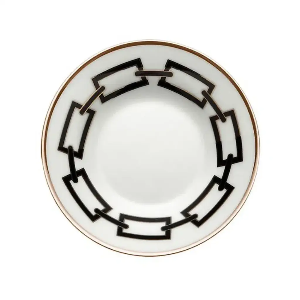 Part of a series of elegant tableware introduced at the Maison&Objet 2019 in Paris, this superb dinner plate is crafted of porcelain. The gleaming surface is adorned with two concentric garlands of triangles in black and white, with four details in gold to match the luxurious gold rim marking the edge of the piece. The center of the plate has a detail of an antique print that depicts the top of the Casquets lighthouse surrounded by clouds dancing in the white sky. This superb piece can be combined with the others in the same Casquets Collection to create a rare effect.