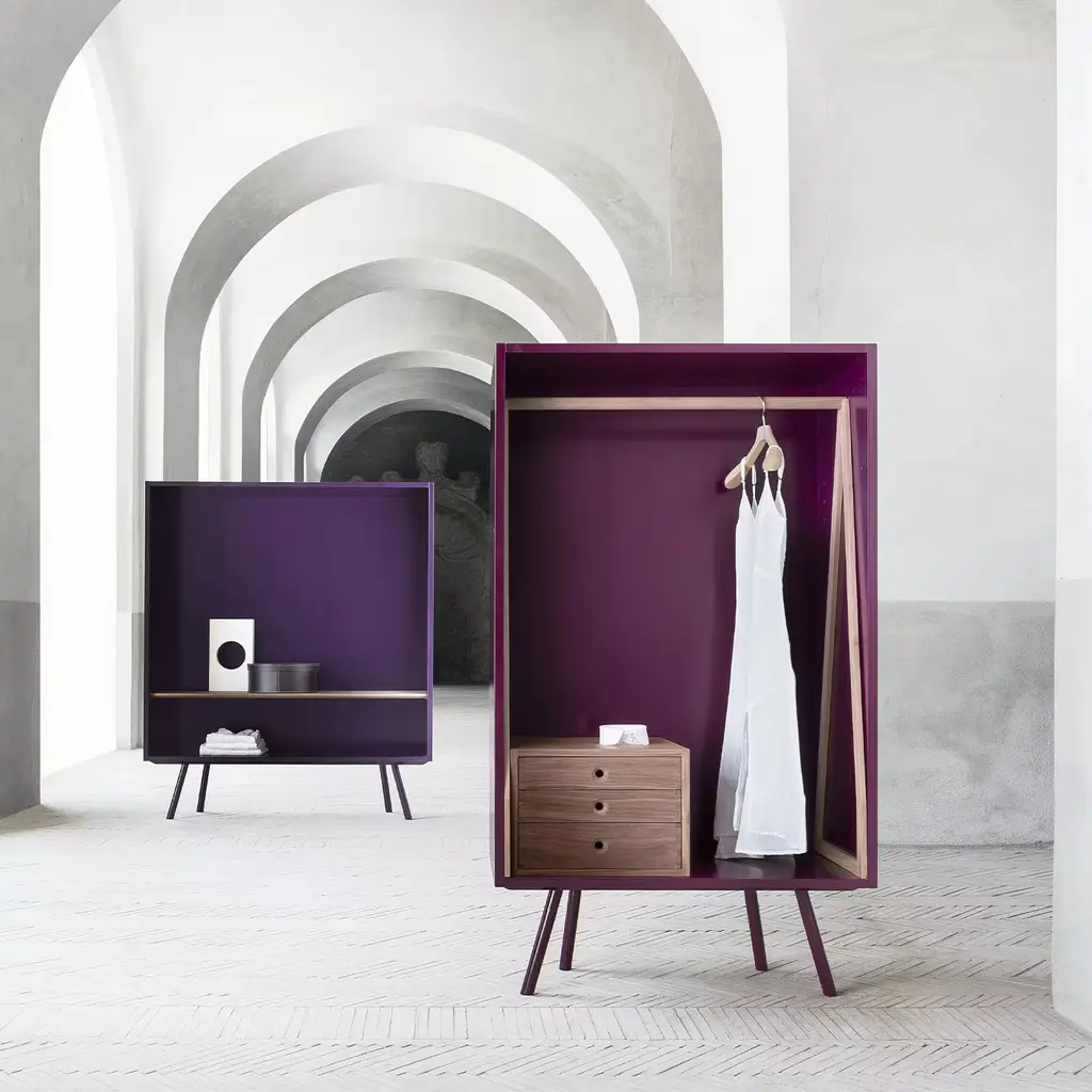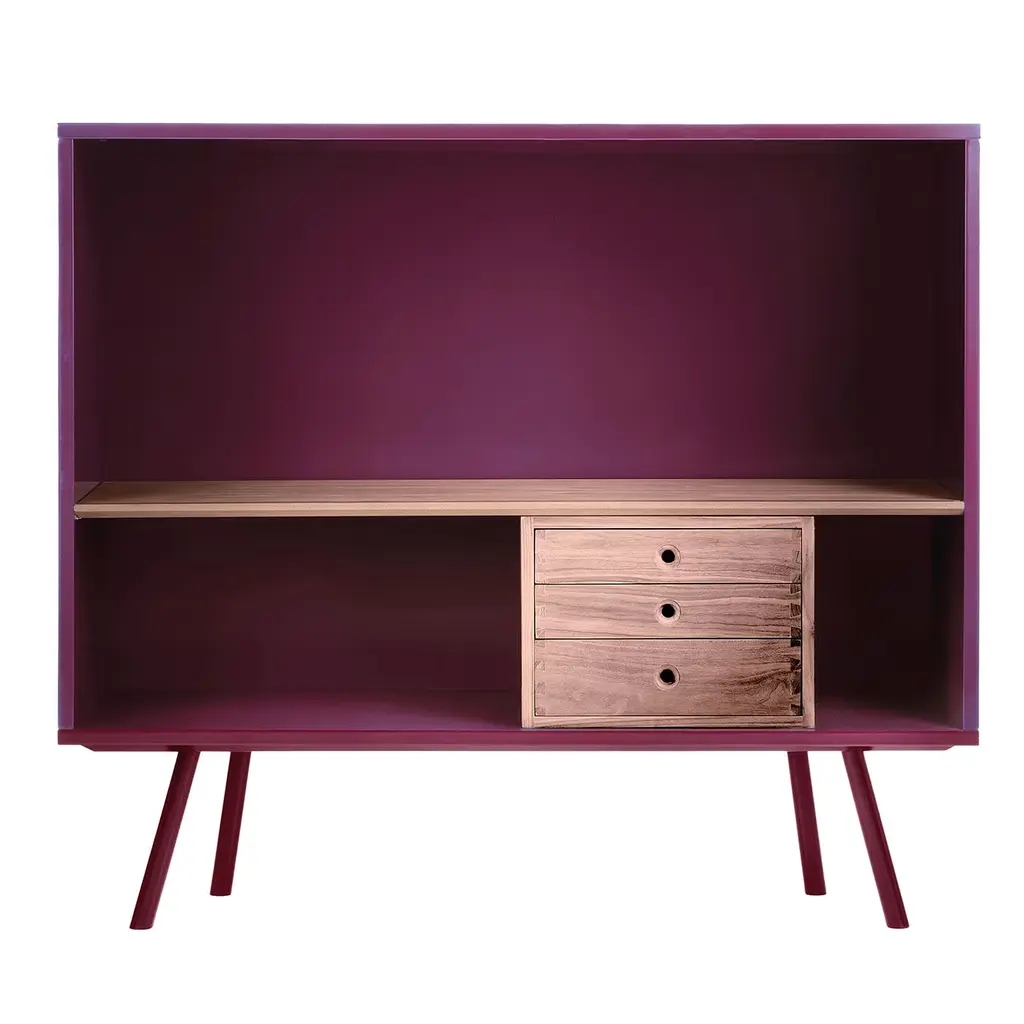 An elegant and charming design characterizes the Casson Open Cupboard in purple amaranth, designed by Daniele della Porta. Supported by slanted legs, the 170 cm tall unit features 3 drawers in solid canaletto walnut and 2 shelves in canaletto walnut veneered plywood with solid wood on the front edge. Also available in red, indigo, bright mustard and dark purple.