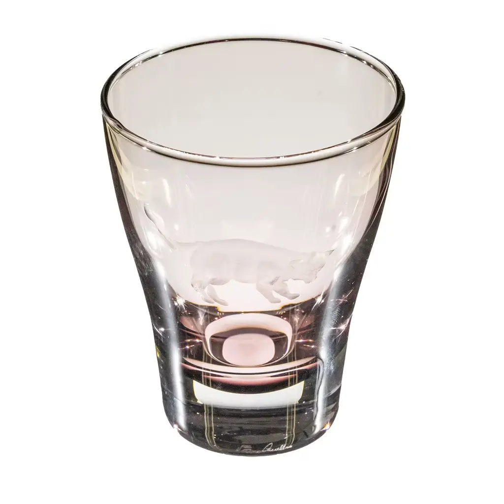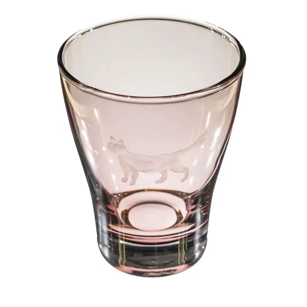 This exquisite set counting six upward-flaring water glasses in mouth-blown purple glass belongs to the playful series of designs dedicated to cats, among pets' most loved breeds. Painstakingly etched by hand, the silhouette of a cat in a fierce hunting pose decorates the piece, implying its singular and tender character. Other five versions with cats in different poses are available.