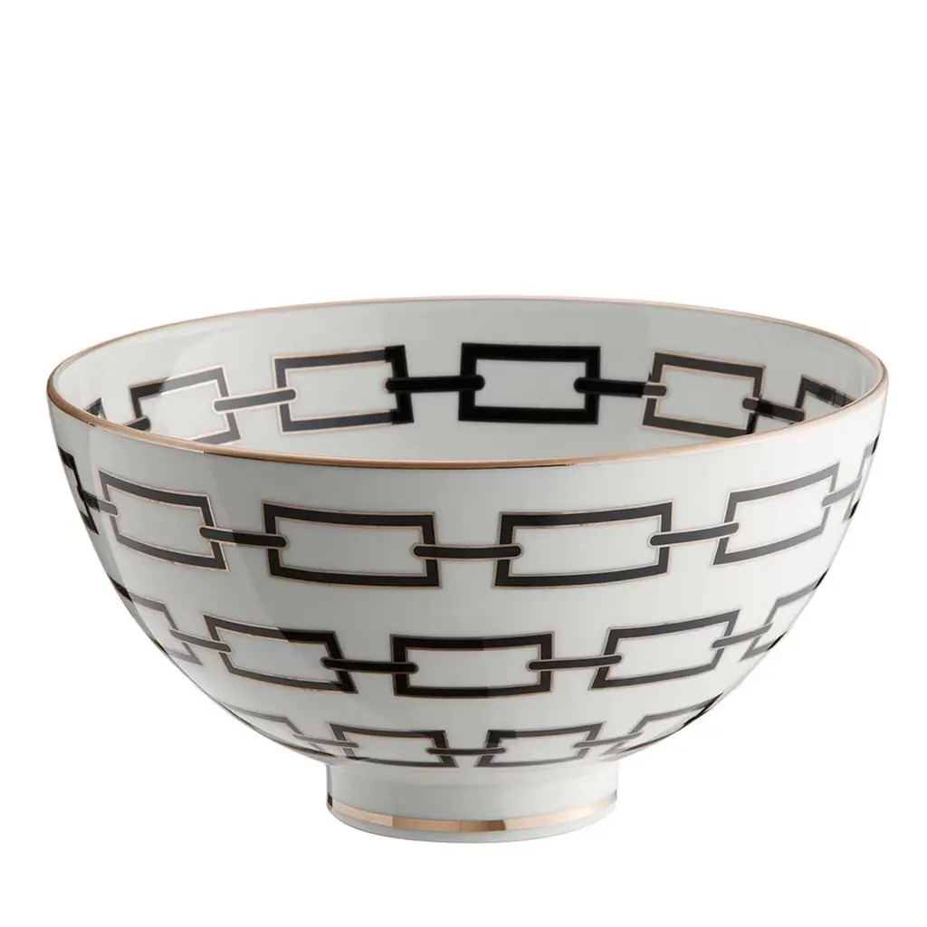 A very young Gio Ponti served as the artistic director of the Manifattura from 1923 to 1933, an incredible decade during which the legendary designer reimagined the art of working with porcelain by translating the legacy of artisan knowledge into new languages that remain contemporary even today. In 1926 many designs took shape out of his irrepressible creativity. Among these, a decoration made up of rectangular rings linked to one another. A chain, indeed. Sophisticated and elegant in its essentiality, but also explosive and disruptive in its geometric movement. A single design, a hint of color that links the porcelain plates, cups and serving platters in the collection, available in four color variants: black, scarlet, emerald and sapphire.