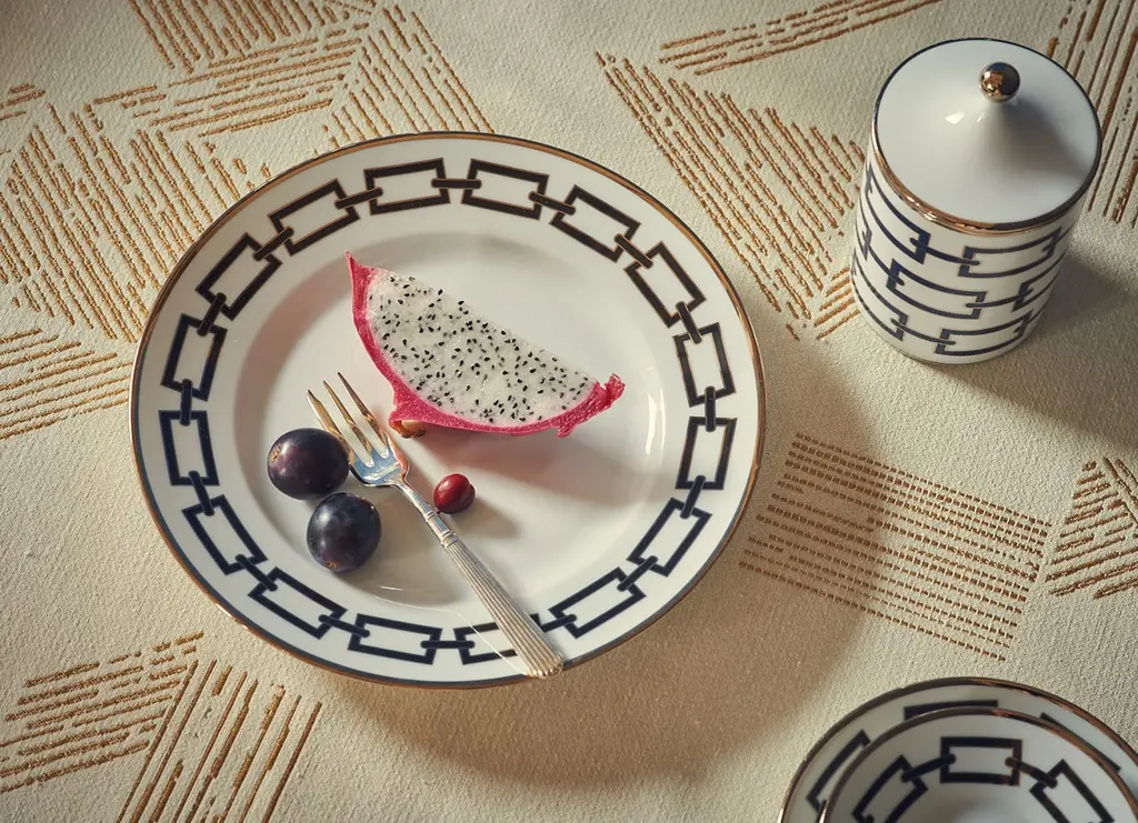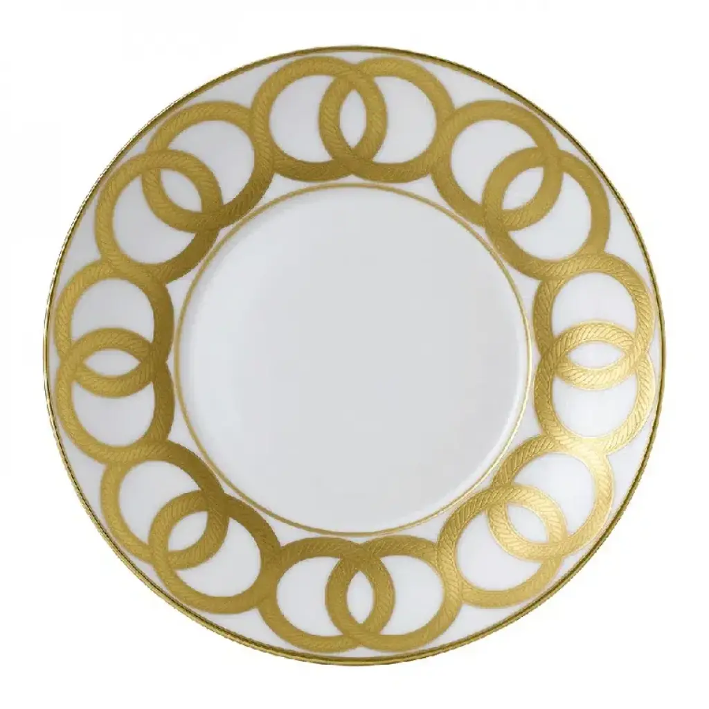 This stunning set of six dessert plates will enrich an after-dinner dessert or an afternoon tea, where it can be combined with other items in the same Catene collection for a cohesive look and magnificent effect. Crafted entirely of porcelain, each piece boasts a pure white background delicately adorned with a geometric decoration in black, with a rim in gold. This stylized chain-like decoration was created in 1926 by iconic designer Gio Ponti and elegantly combines traditional aesthetic and modern sensibility.