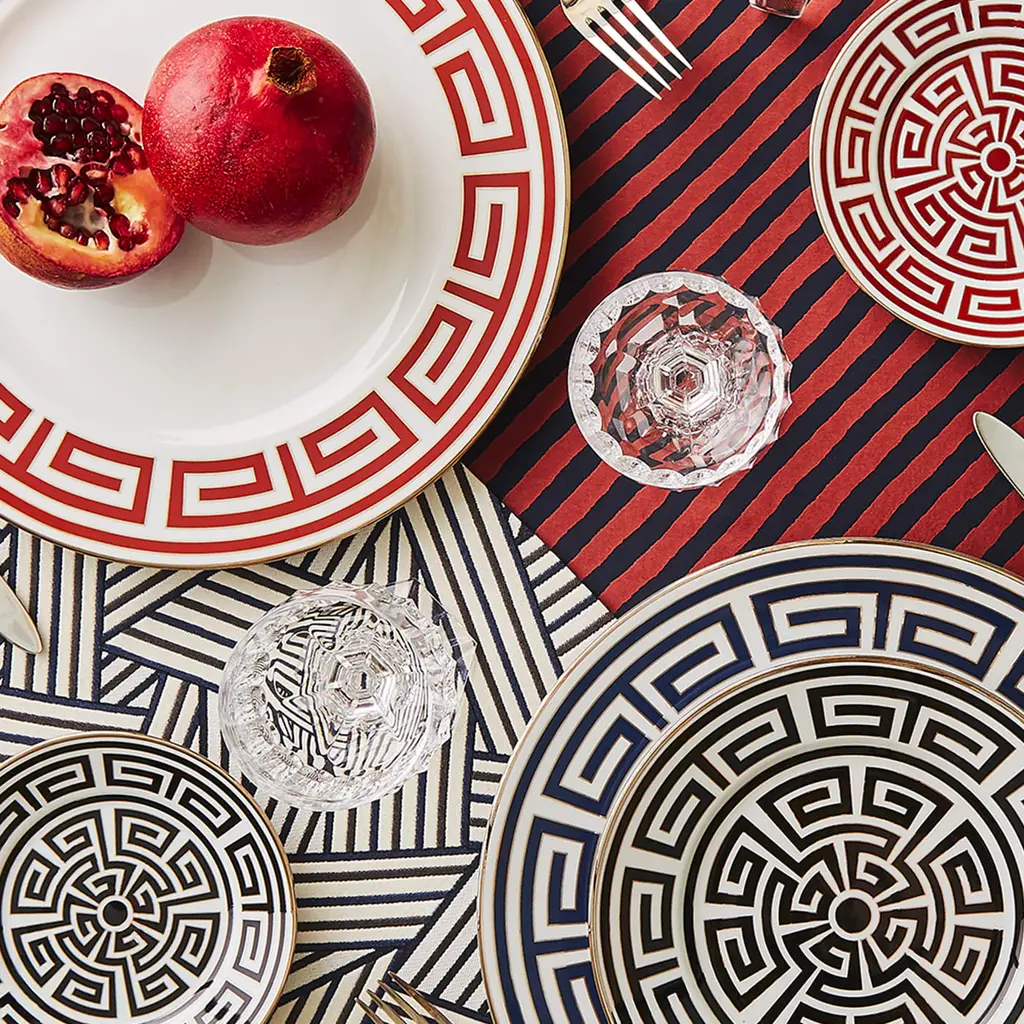 This elegant set of six dessert plates will be equally stunning on a classic table or in a modern setting. Crafted entirely of porcelain, it can be combined with the others in the same collection to complete a tableware series or it can be used to complement a tea or coffee setting. Each plate boasts a white background with a gold rim running around its perimeter, while a scarlet-red decoration creates a chain-like pattern that is both modern and sophisticated. This design was inspired by a 1926 drawing by iconic master Gio Ponti, when he was the brand's creative director.