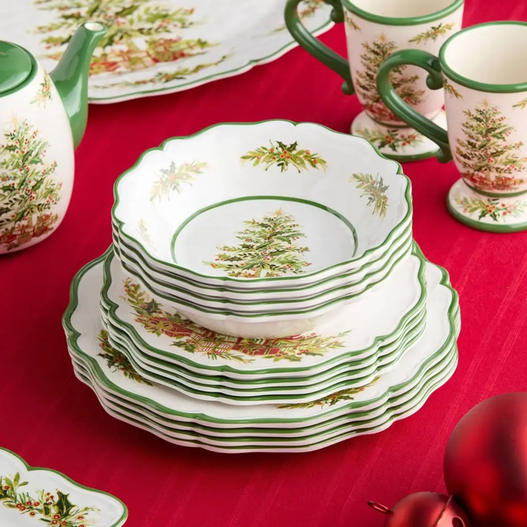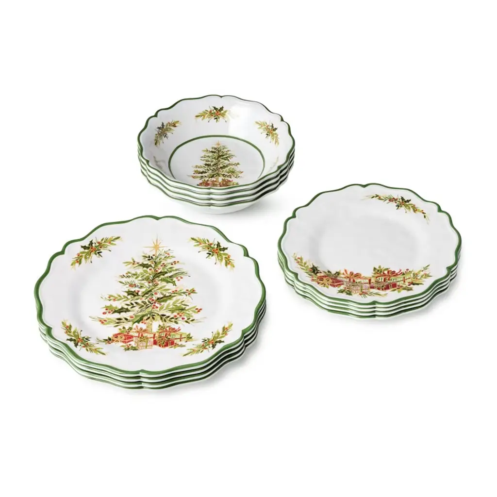 Transform your holiday table into a winter wonderland with the Holly Tree 12-Piece Holiday Dinnerware Set. Crafted from durable, break-resistant melamine, this charming collection blends festive style with everyday practicality. Each piece features a beautifully detailed Christmas tree adorned with ornaments, ribbons, and holly, framed by a classic green scalloped border. Perfect for indoor family dinners or outdoor seasonal gatherings, this set brings timeless Christmas charm to any setting. Lightweight yet sturdy, the dinnerware is dishwasher safe for effortless cleanup after festive meals. Whether you're hosting Christmas dinner, a winter brunch, or a casual holiday party, the Holly Tree set adds joyful elegance and warmth to your table. Part of a coordinating collection, it's also a wonderful gift for the holiday host or a delightful way to refresh your seasonal décor.