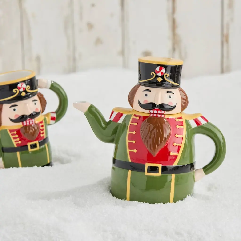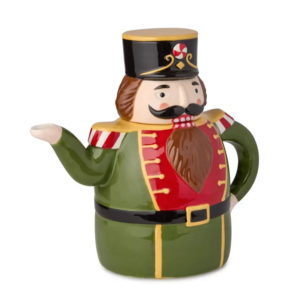 Infuse your holiday celebrations with cheer using the Nutcracker Parade 3-D Nutcracker Teapot, a whimsical ceramic kettle perfect for serving tea, mulled cider, or hot chocolate. Crafted in the shape of a traditional holiday nutcracker, this 30-ounce teapot is a festive statement piece that adds instant charm to your Christmas table décor. Its bold, hand-detailed design features vibrant holiday colors, intricate uniform detailing, and a peppermint-themed hat, making it both functional and decorative. Whether you're hosting a Christmas brunch or enjoying a cozy winter afternoon by the fire, this teapot brings warmth and nostalgia to every sip. Ideal for holiday entertaining or gifting, it pairs perfectly with the full Nutcracker Parade collection for a coordinated seasonal table. Gift it to tea lovers, collectors, or anyone who appreciates unique, cheerful holiday accents.