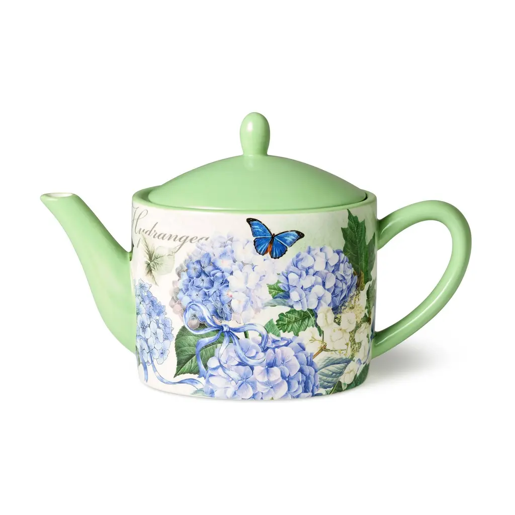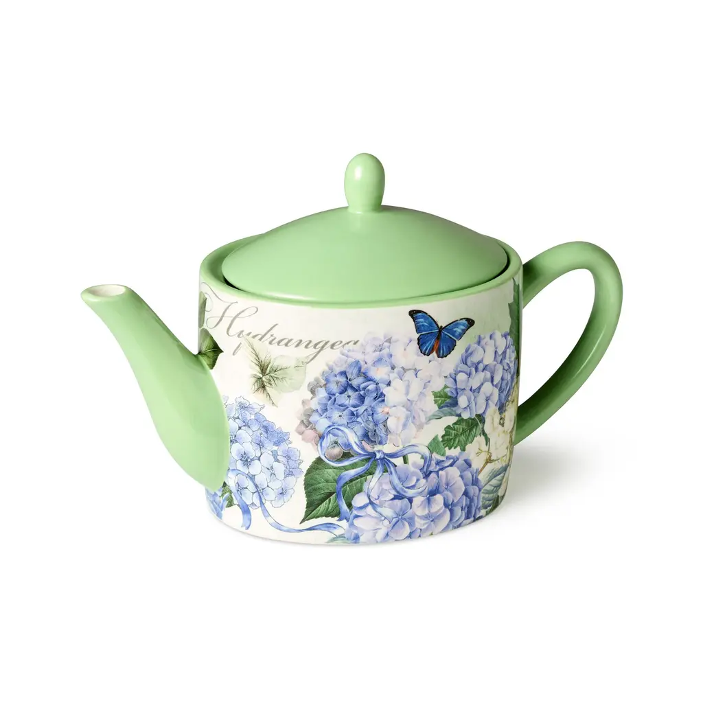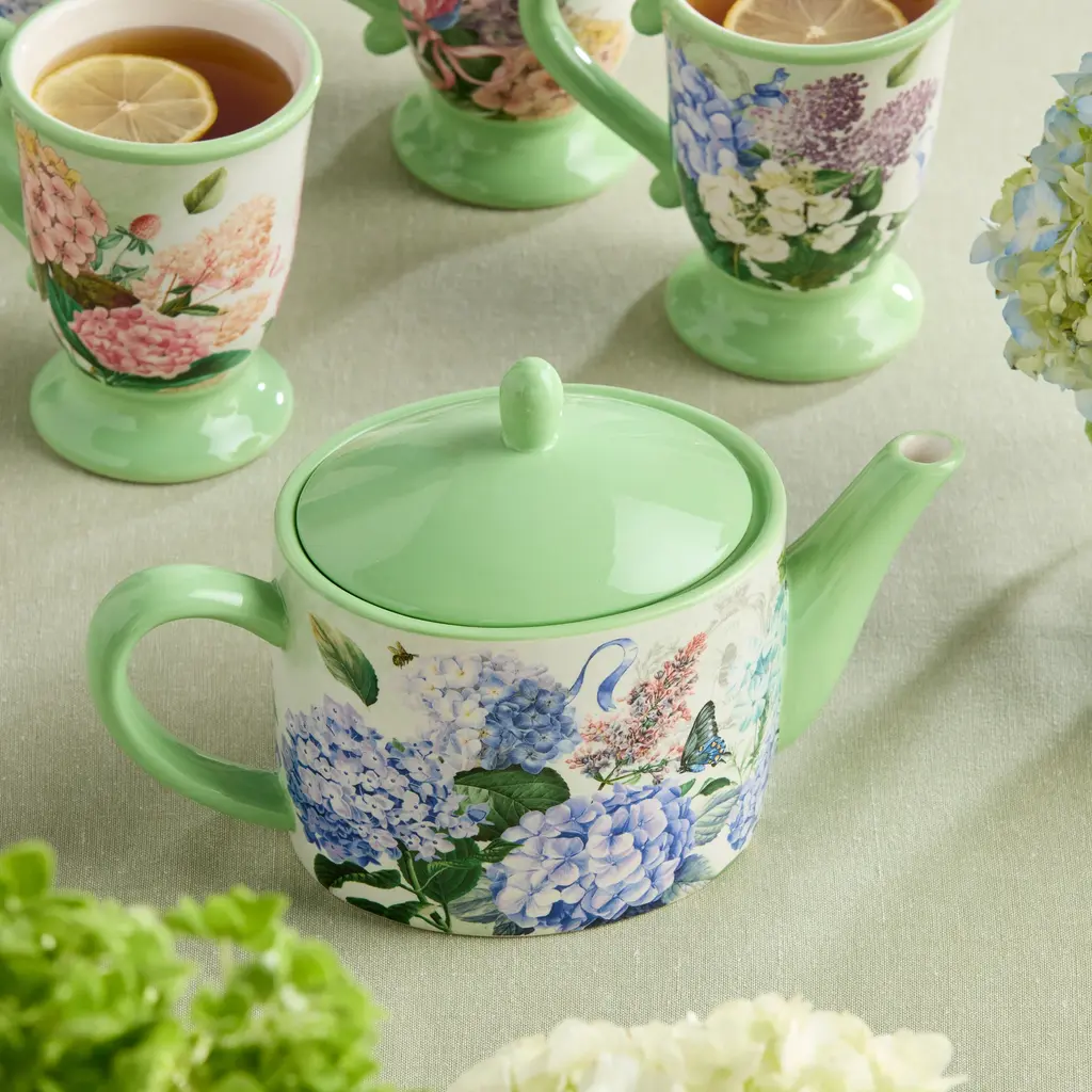 Elevate your tea experience with the Garden Path Ceramic Teapot, 36 oz., featuring a charming hydrangea design in soft pink, purple, and white hues, beautifully complemented by delicate butterfly accents. This teapot combines timeless elegance with practical functionality, making it a versatile addition to your kitchen or dining decor. Whether you're hosting a sophisticated afternoon tea or enjoying a cozy moment alone, this decorative ceramic teapot is sure to bring warmth and beauty to any occasion. Its generous 36 oz. capacity is perfect for brewing multiple servings, and the smooth green handle ensures effortless pouring. Crafted from durable ceramic, this piece offers lasting quality while retaining heat to keep your tea warm longer. With its intricate floral pattern and vibrant color palette, it doubles as a striking centerpiece or thoughtful gift for tea lovers and nature enthusiasts alike.Features: Dimensions: This product will ship to you in one (1) box.