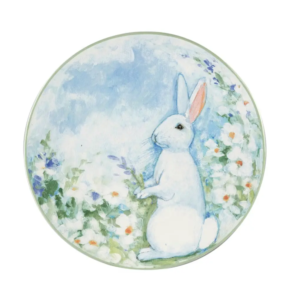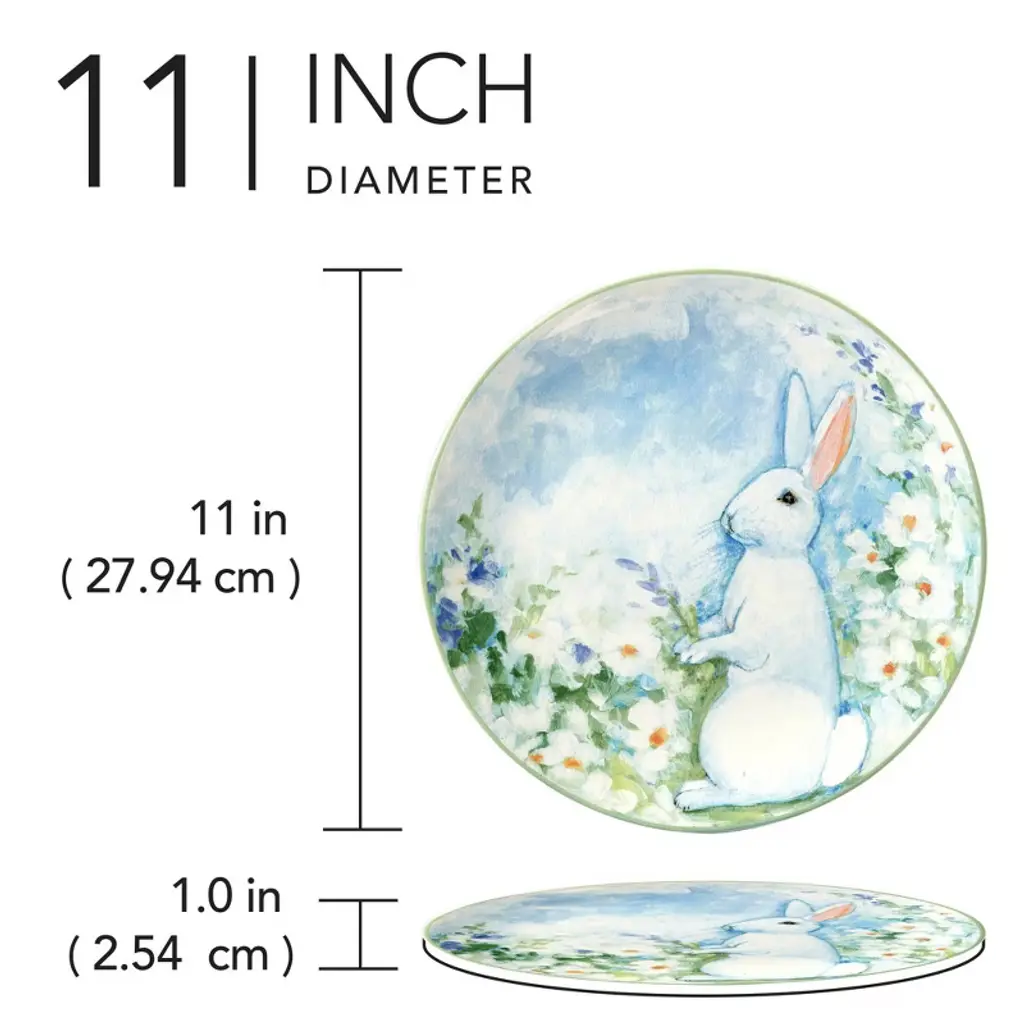 Delve into the whimsy of spring with Certified International's Easter Morning Dinner Plate designed by Susan Winget. Measuring a generous 10.75 inches in diameter. Every detail captures the season's essence, from the soft pastel blue background reminiscent of a clear Easter morning sky, to the gentle white rabbit, beautifully detailed with hints of azure and blush. This plate is not just tableware; it's a story, a memory, and a work of art.