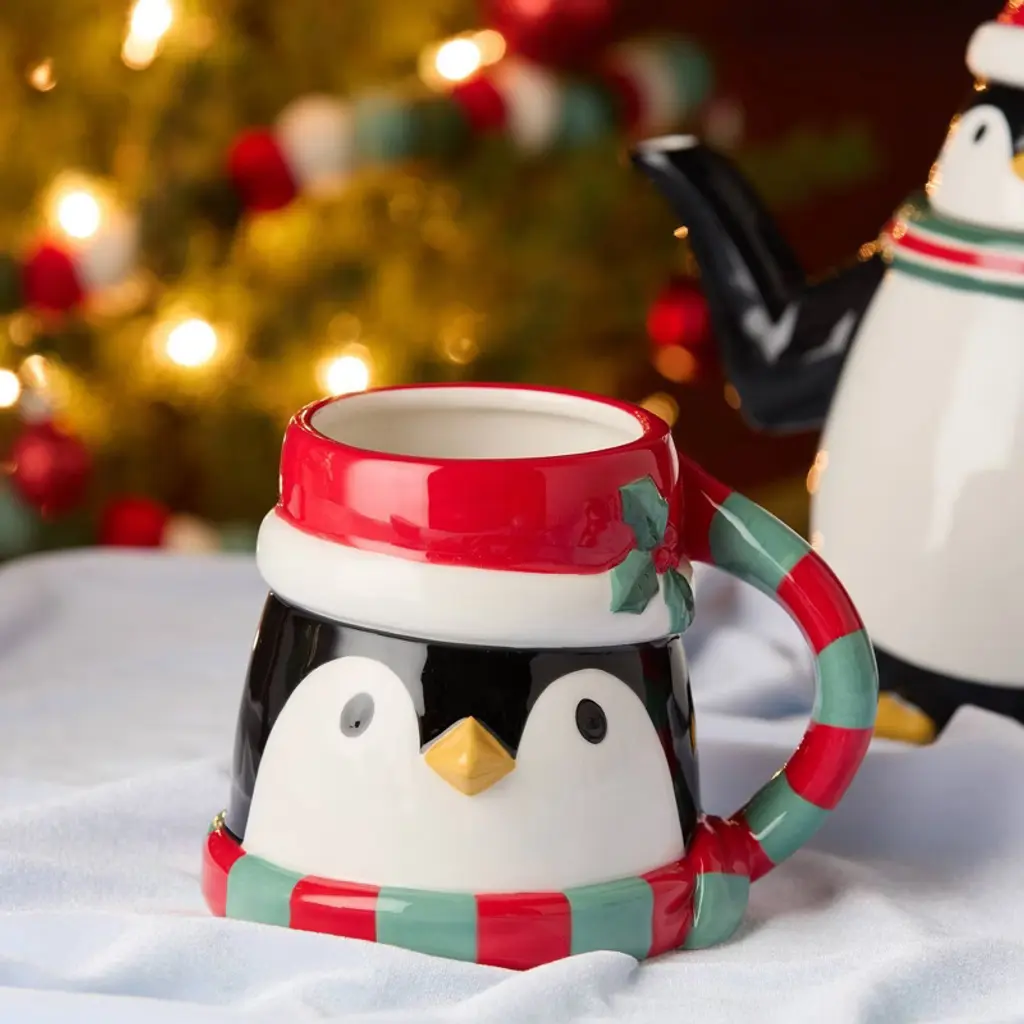 Add personality to your holiday sips with the Christmas Whimsy 3D Penguin Mugs. This set of four ceramic mugs features a sculpted 3D design shaped like adorable penguins, each one styled with its own printed winter accessories—from earmuffs and scarves to Santa hats and gift boxes. These charming characters are not hand-painted, ensuring vivid, consistent color and detail across all four. Perfectly sized at 18 ounces, they’re ideal for coffee, cocoa, tea, or any festive beverage. The sturdy handles and wide openings make them practical for everyday use while still playful enough for entertaining. Whether you’re building a cocoa station, gifting your favorite teacher, or enjoying a cozy evening by the fire, these mugs are a joyful addition to your seasonal kitchen. Crafted from durable ceramic however not recommended for the dishwasher or microwave.