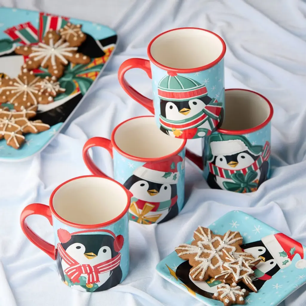 Wrap your hands around the warmth of the season with the Christmas Whimsy Penguin Mugs. This ceramic set includes four 18oz mugs, each featuring a unique penguin dressed in colorful winter gear—from cozy scarves and hats to earmuffs and gifts. Whether you're sipping hot cocoa, herbal tea, or your favorite holiday latte, these mugs add cheer and charm to every cozy moment. Made from high-quality ceramic and finished with a glossy glaze, they’re built to last through countless holiday seasons. The bold red handles and rims add a festive pop to your drinkware collection, while the whimsical penguin illustrations make these mugs a joy to give and receive. Dishwasher safe for easy cleanup and generously sized for marshmallows, whipped cream, or a second pour. Perfect for setting up a hot chocolate bar or gifting to friends, coworkers, or teachers. Pair with other Christmas Whimsy serveware for a coordinated and spirited seasonal experience.