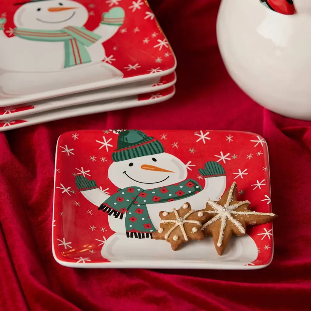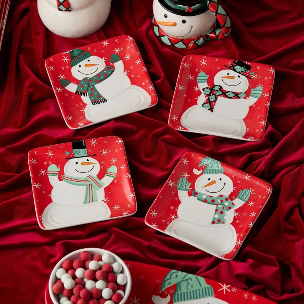 Delight your guests with a sprinkle of snowy joy using the Christmas Whimsy Snowman Set of 4 Canape Plates. These 6-inch square ceramic appetizer plates feature four charming snowmen, each wearing festive scarves and hats in cheerful patterns, set against a bold red background with dancing snowflakes. Perfect for serving hors d’oeuvres, cookies, desserts, or small bites during holiday parties or everyday winter meals, these plates instantly add merriment to your table. Made from durable ceramic, they are microwave and dishwasher safe, blending beauty with convenience. Use them to create a coordinated seasonal spread with our matching mugs and dessert plates or gift them as part of a cheerful host or hostess gift. Whimsical, vibrant, and functional, these plates are a must-have for holiday entertaining.