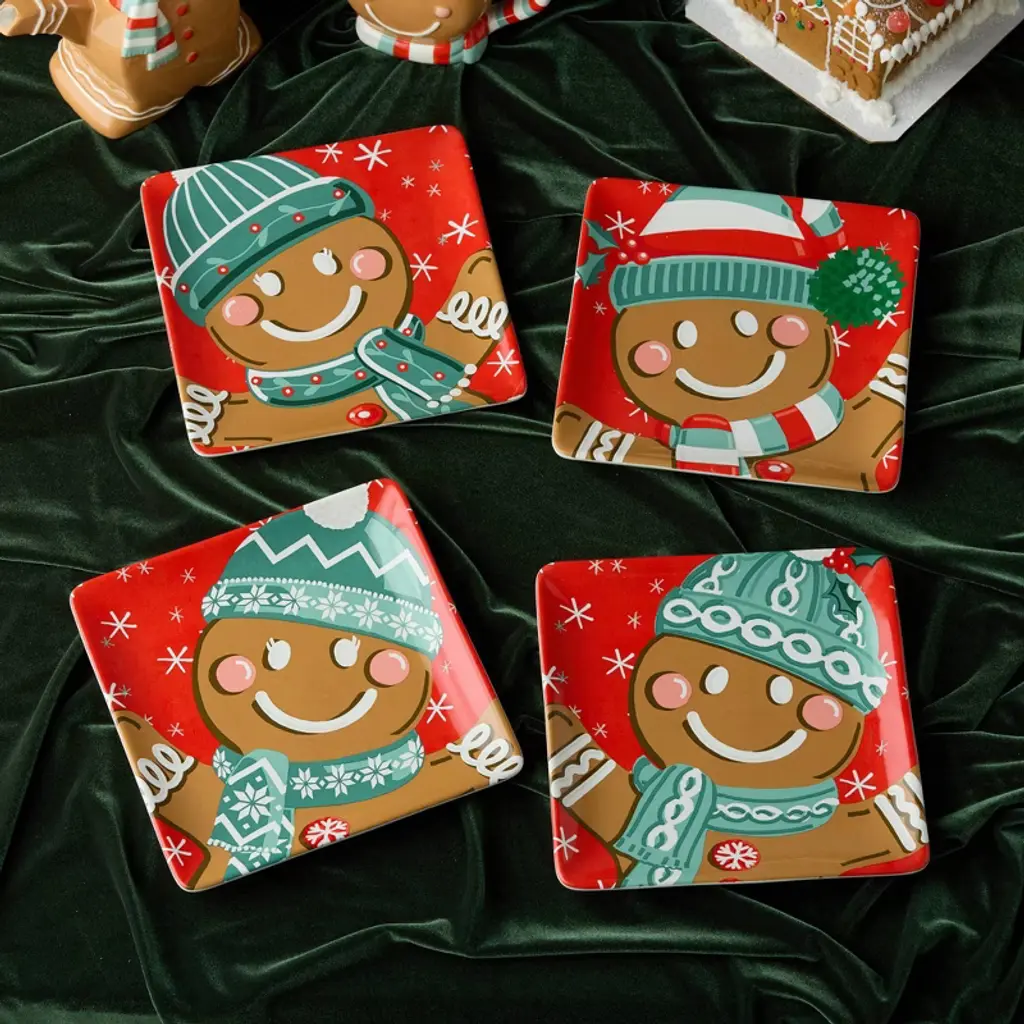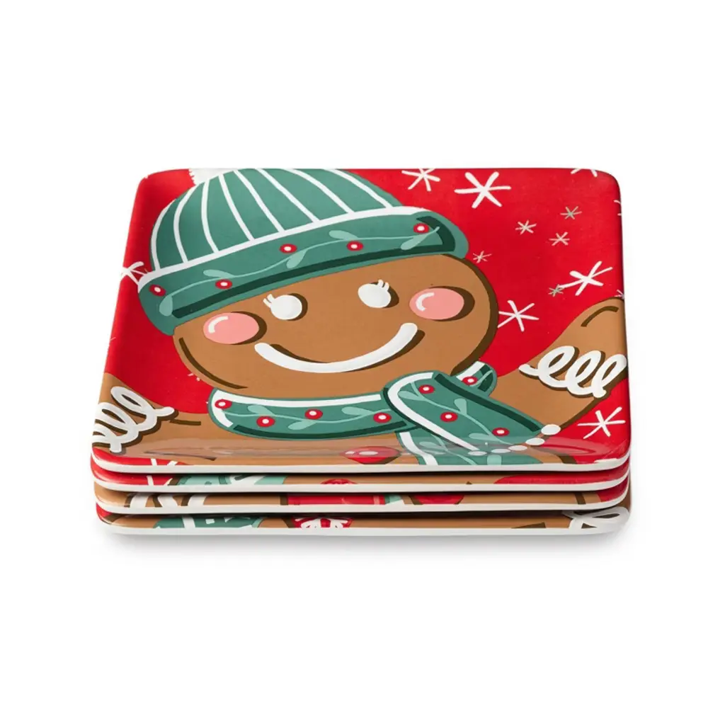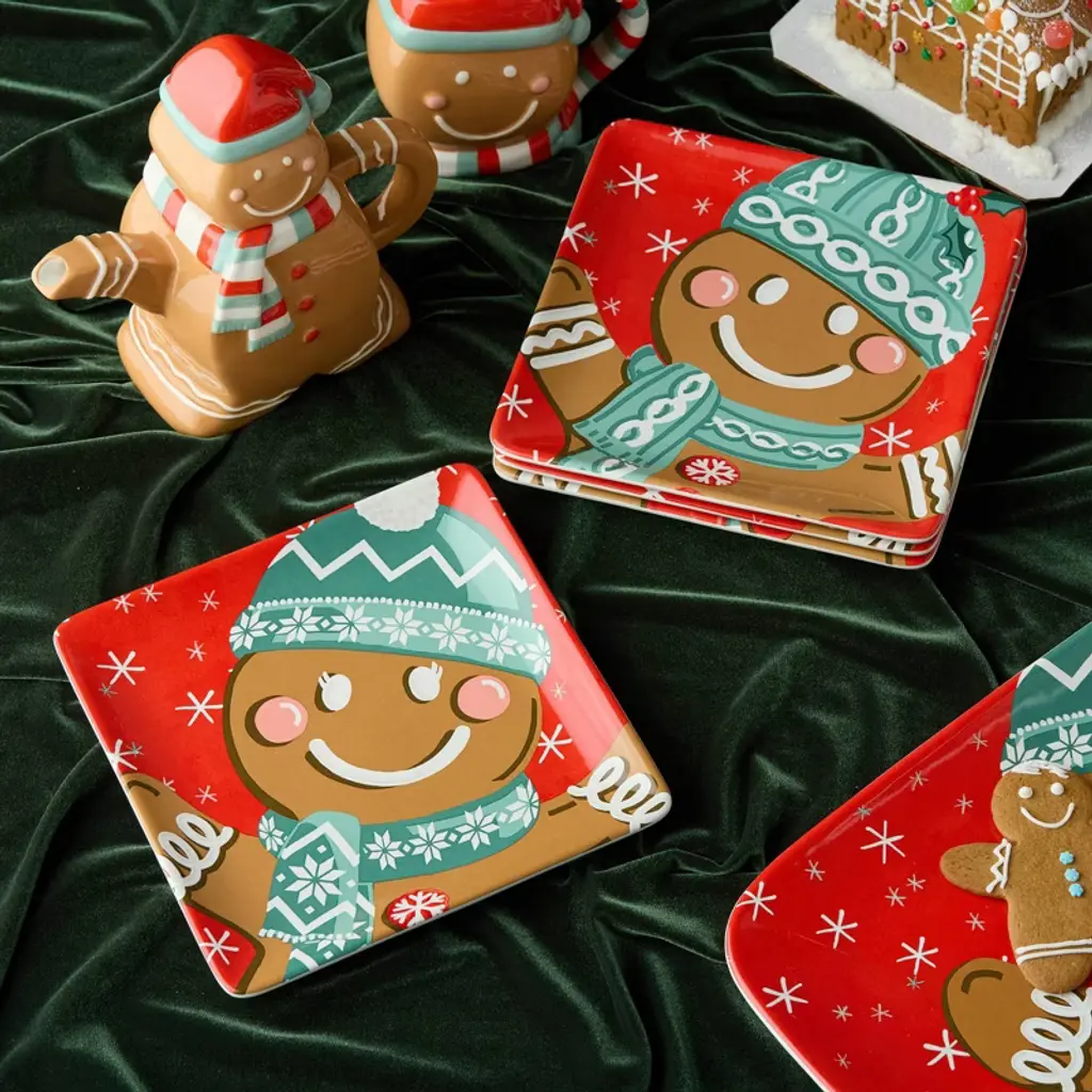 Add a dash of gingerbread magic to your holiday table with our Christmas Whimsy Gingerbread 8.5" Dessert Plates! This set includes four square ceramic plates, each featuring a different cheerful gingerbread friend bundled up in cozy winter scarves and festive hats. With vibrant red backgrounds and dancing snowflakes, they bring playful warmth to your desserts, snacks, or appetizers. These plates are perfect for cookie exchanges, holiday gatherings, or simply brightening up your December dinners. At 8.5 inches wide, they offer plenty of space for your favorite seasonal treats. Durable, dishwasher safe, and brimming with holiday cheer, they also make a thoughtful gift for hosts, bakers, or anyone who loves a whimsical Christmas. Pair them with our matching mugs and canapés for a coordinated collection you’ll love displaying all season long.