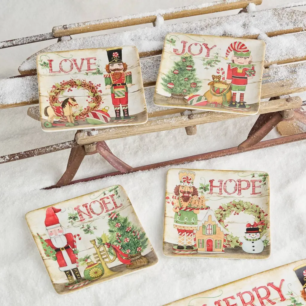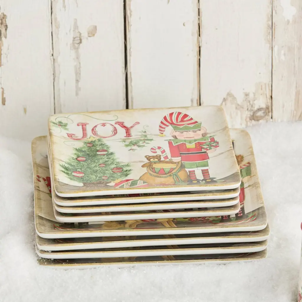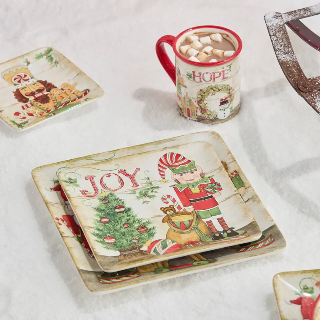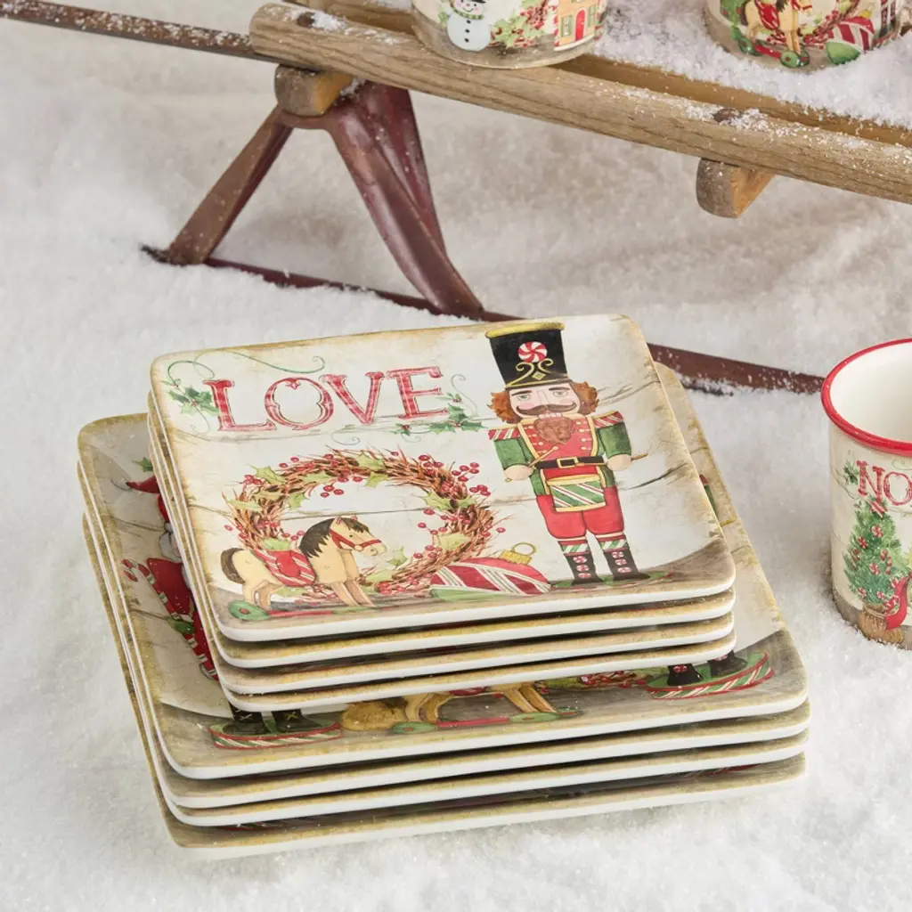 Add vintage holiday charm to your table with the Nutcracker Parade Ceramic Dessert Plates. This festive set of four showcases nostalgic Christmas illustrations including Santa, an elf, toy soldier, and snowman, each exuding warmth and storybook magic. Made from durable ceramic, they are perfect for holiday desserts, snacks, and appetizers, while being microwave and dishwasher safe for easy everyday use. Whether you're serving cookies for Santa or adding whimsical charm to a holiday brunch, these plates deliver beauty and functionality. Pair them with coordinating dinnerware or give them as a joyful gift. Their timeless design and festive flair bring tradition and delight to any Christmas gathering.