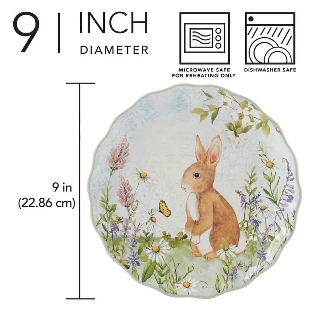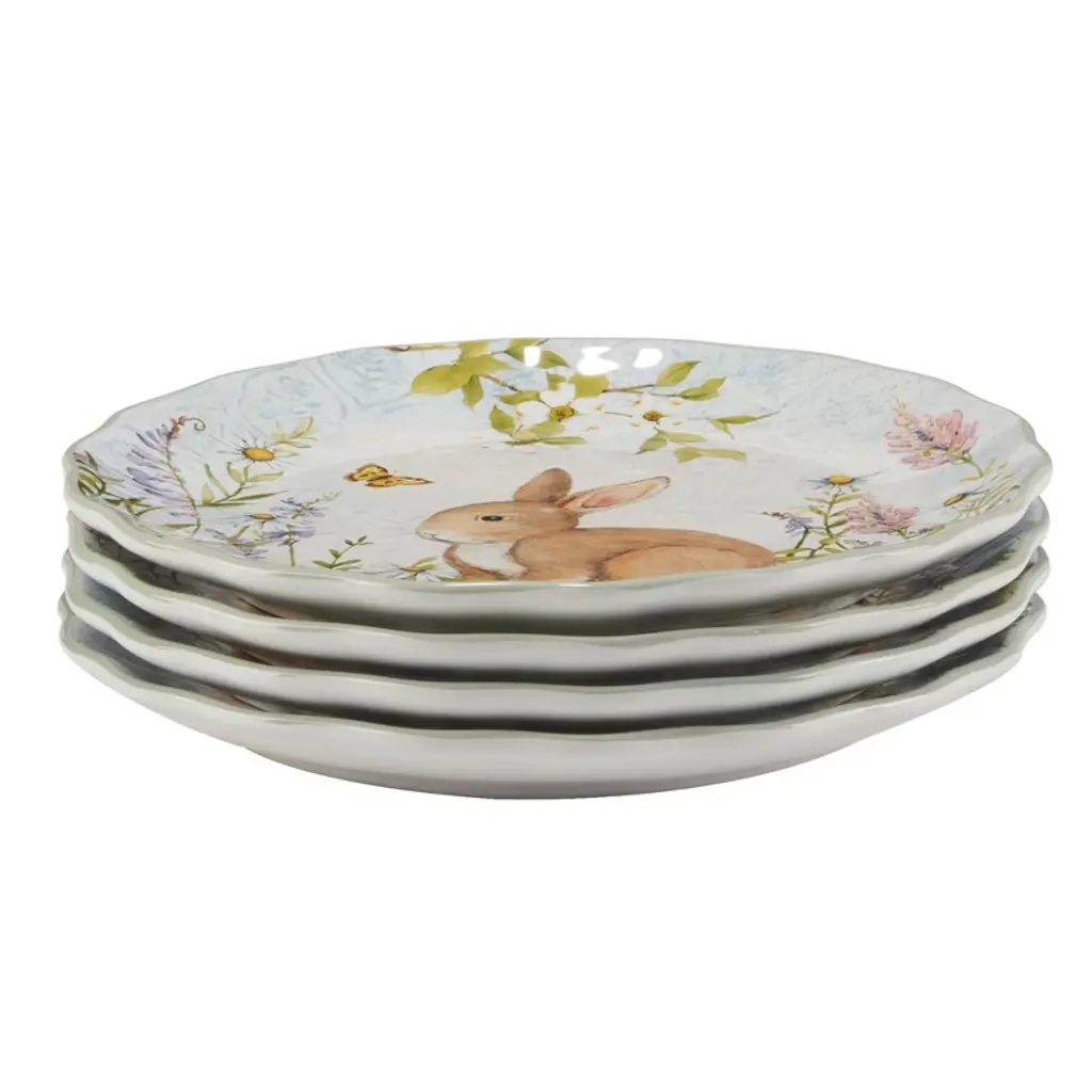 Perfect for sweet treats or small bites, the Easter Meadow Set of 4 Dessert Plates is designed to add charm to your dessert presentations. These 9-inch plates feature detailed illustrations of playful bunnies amidst blooming wildflowers, making them ideal for springtime celebrations or afternoon tea. Ideal for Easter celebrations or any spring gathering, it will add a touch of charm and elegance to your entertaining.