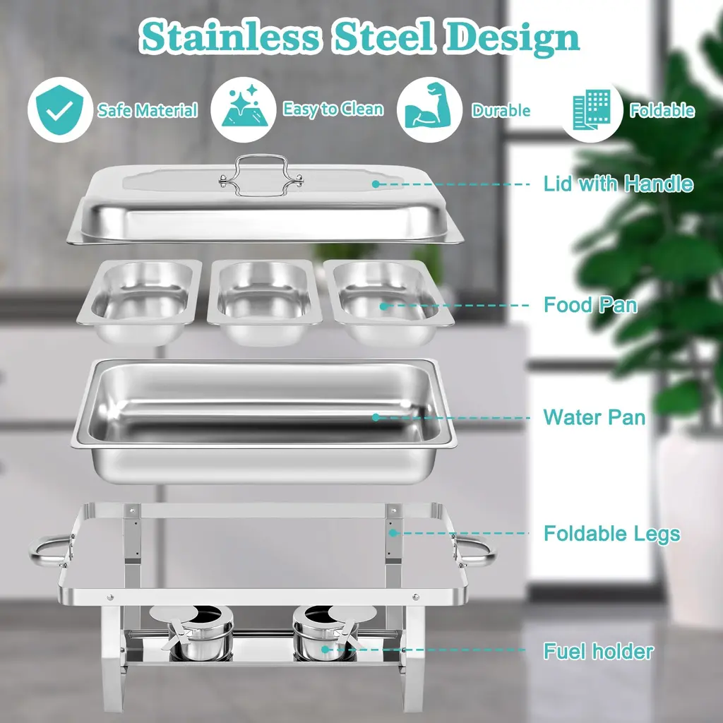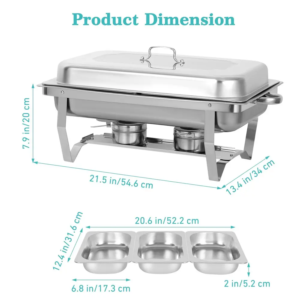 Warm and Fresh: It allows you to maintain the temperatures of all your favorite foods. Supported by fuel holders, our dish can heat various foods while maintaining their fresh taste. Besides, you can also add ice to the water tray to keep foods cool. Capacity: You will have enough space to serve all your delicious meals! chafing dish presents you with food pans, which easily accommodates hot appetizers or side dishes. Food-Grade Stainless Steel: It is rust resistant and ensure long durability, our dish buffet set features easy maintenance and cleaning. It is easy to package, transport, and store with foldable legs. Complete Accessories Set: This dish buffet set contains fuel holders (fuel is not included), foldable frames, water trays, food pans, lids with handle. Convenient to prepare, display and enhance your next catered event elegantly. Applicable Occasions: Our dish set is ideal for restaurants, buffets, catering, schools, and corporate events that will showcase the cuisine in a professional manner.