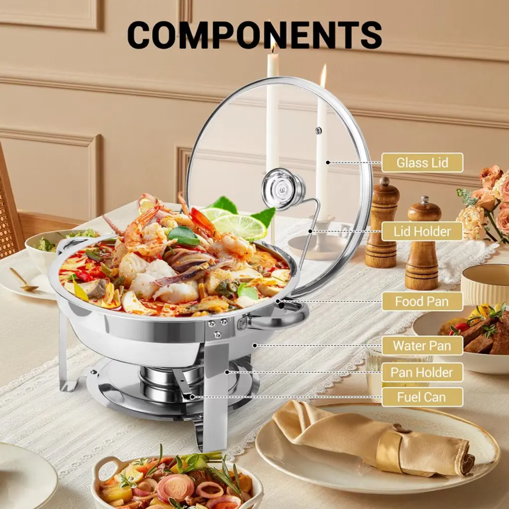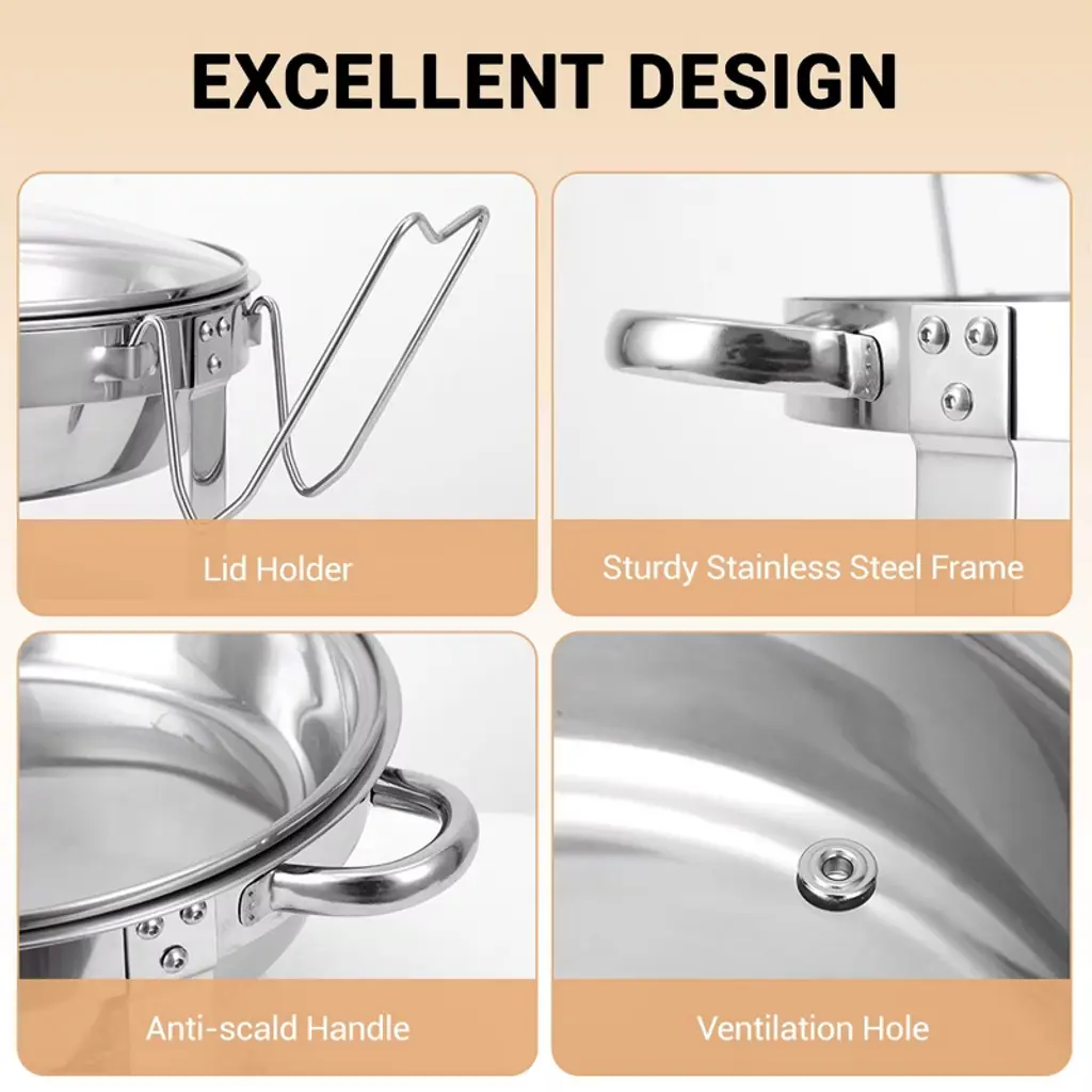 Chafing Dishes for BuffetElevate your dining experience with the premium buffet chafing dish set—perfect for impressing your guests at any gathering!Highlights at a Glance:High-grade, food-safe stainless steel for durability and rust resistanceComplete set with essential components for elegant food presentationEffortless switching between hot and cold serving optionsQuick and easy cleanup for more quality time with loved onesVersatile design suitable for any occasion, from casual gatherings to formal eventsSpecifications:Capacity:6QTHeating Method: FuelFood Pan Size: 13.3 x 2.4 inchesWater Pan Size:13 x 3.2 inchesColor: Silver, Silver and GoldMaterial: Stainless SteelFriendly Note: After receiving food warmers for parties, please check if the accessories are complete.Use the anti-scald handles when lifting the lids or moving the chafing dish to avoid burns. Always exercise caution when handling hot itemsEnsure that the round stainless steel chafing dish set and its components are kept out of reach of children during and after use.