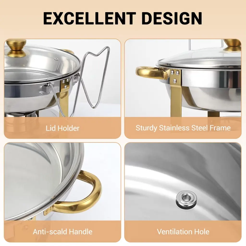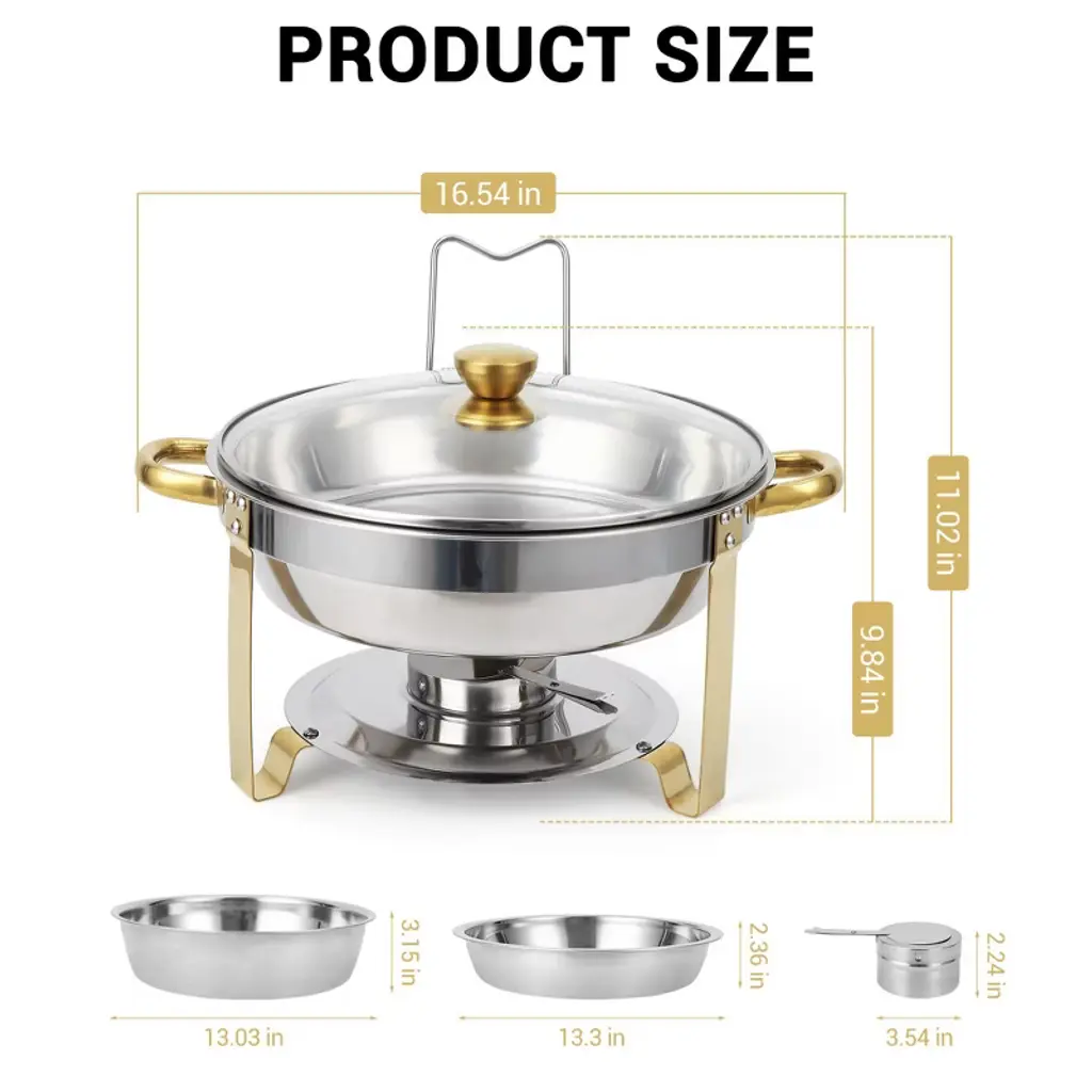Chafing Dishes for BuffetElevate your dining experience with the premium buffet chafing dish set—perfect for impressing your guests at any gathering!Highlights at a Glance:High-grade, food-safe stainless steel for durability and rust resistanceComplete set with essential components for elegant food presentationEffortless switching between hot and cold serving optionsQuick and easy cleanup for more quality time with loved onesVersatile design suitable for any occasion, from casual gatherings to formal eventsSpecifications:Capacity:6QTHeating Method: FuelFood Pan Size: 13.3 x 2.4 inchesWater Pan Size:13 x 3.2 inchesColor: Silver, Silver and GoldMaterial: Stainless SteelFriendly Note: After receiving food warmers for parties, please check if the accessories are complete.Use the anti-scald handles when lifting the lids or moving the chafing dish to avoid burns. Always exercise caution when handling hot itemsEnsure that the round stainless steel chafing dish set and its components are kept out of reach of children during and after use.