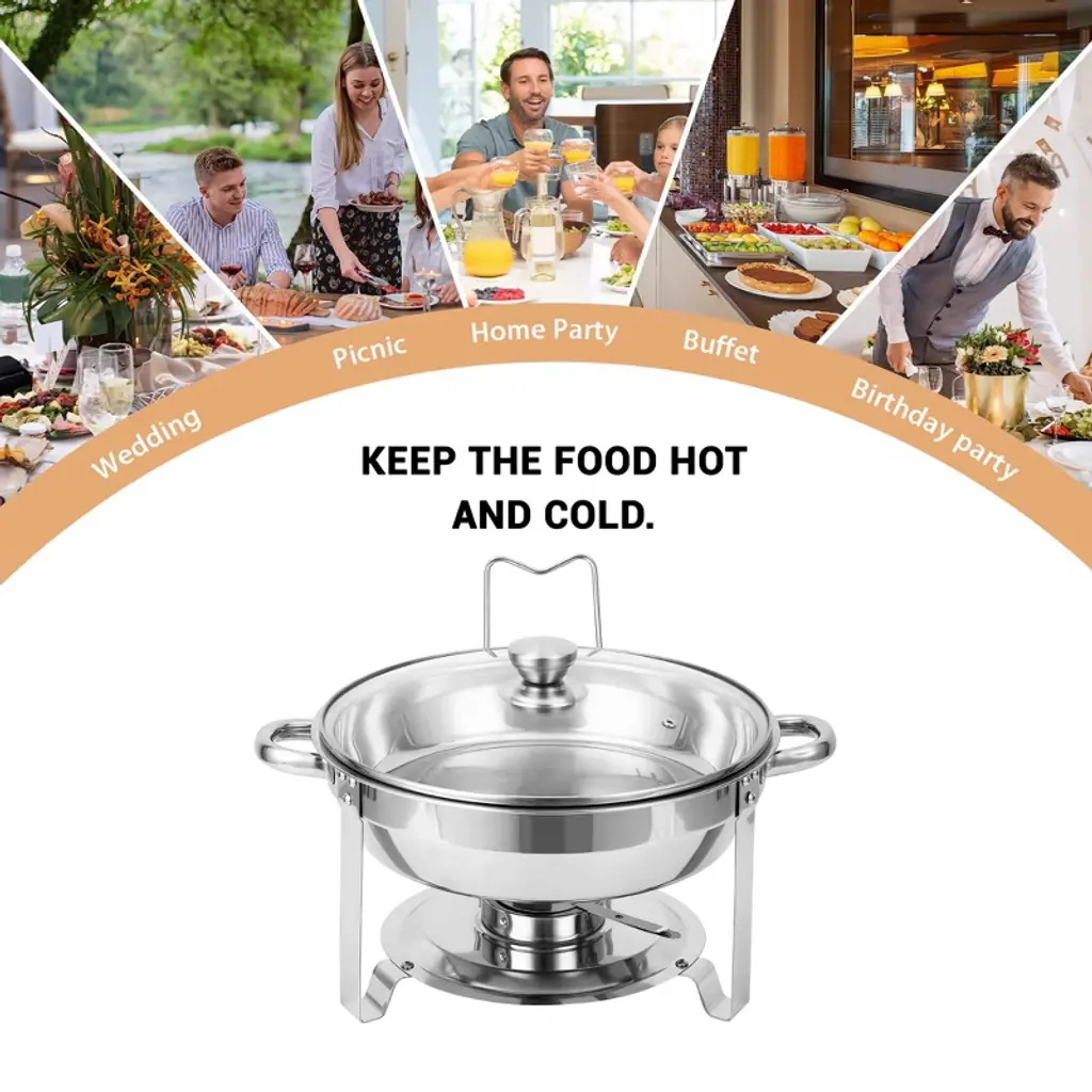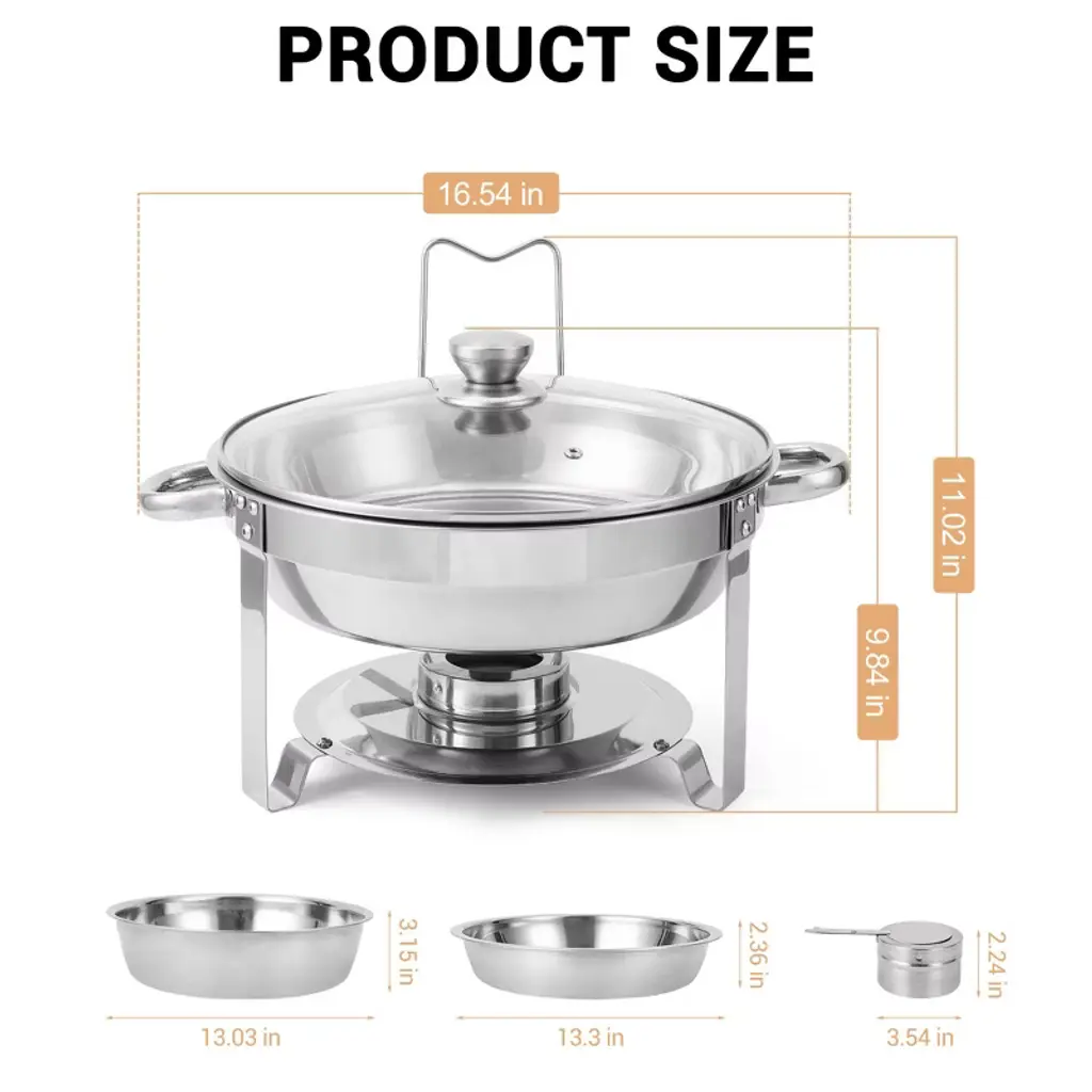 Chafing Dishes for BuffetElevate your dining experience with the premium buffet chafing dish set—perfect for impressing your guests at any gathering!Highlights at a Glance:High-grade, food-safe stainless steel for durability and rust resistanceComplete set with essential components for elegant food presentationEffortless switching between hot and cold serving optionsQuick and easy cleanup for more quality time with loved onesVersatile design suitable for any occasion, from casual gatherings to formal eventsSpecifications:Capacity:6QTHeating Method: FuelFood Pan Size: 13.3 x 2.4 inchesWater Pan Size:13 x 3.2 inchesColor: Silver, Silver and GoldMaterial: Stainless SteelFriendly Note: After receiving food warmers for parties, please check if the accessories are complete.Use the anti-scald handles when lifting the lids or moving the chafing dish to avoid burns. Always exercise caution when handling hot itemsEnsure that the round stainless steel chafing dish set and its components are kept out of reach of children during and after use.