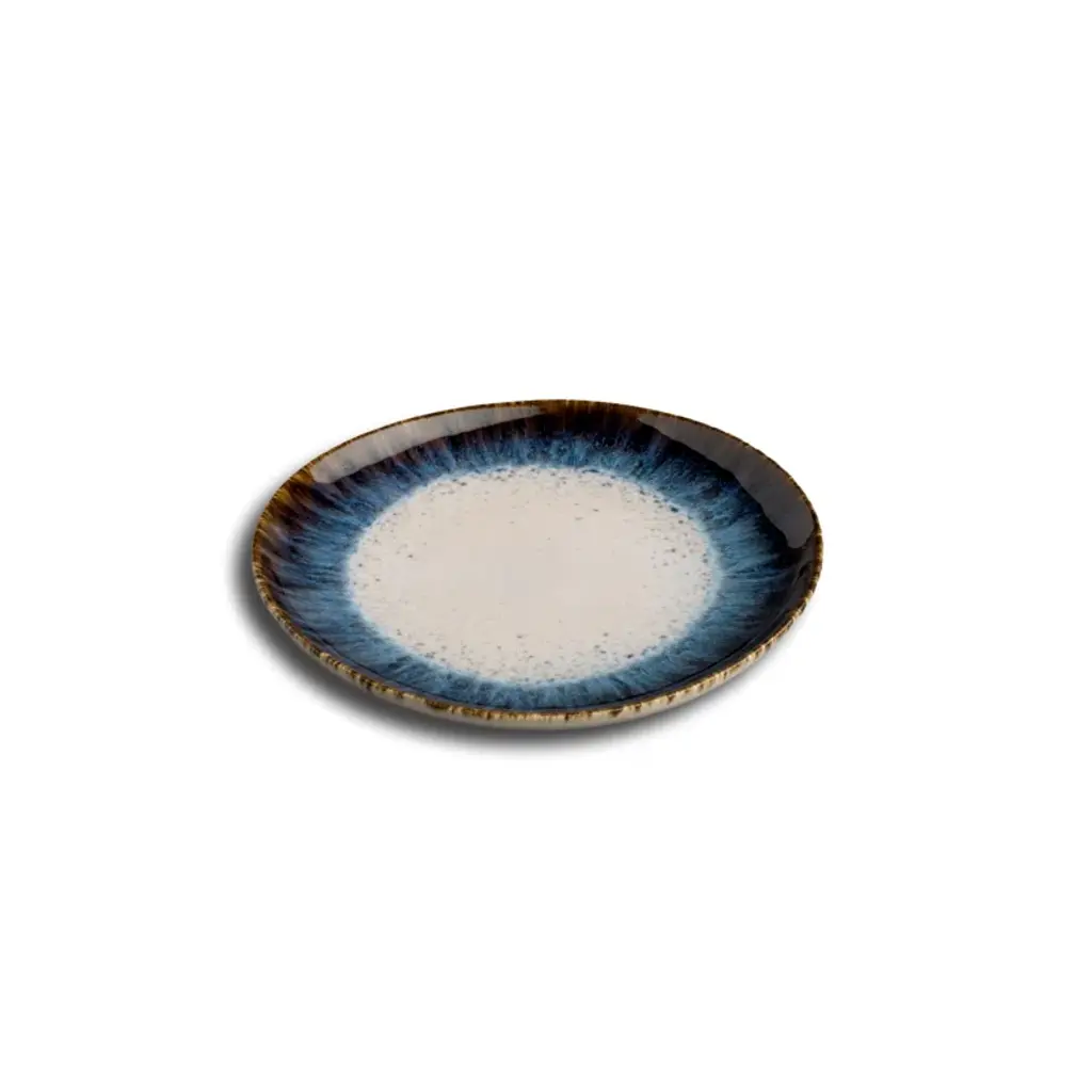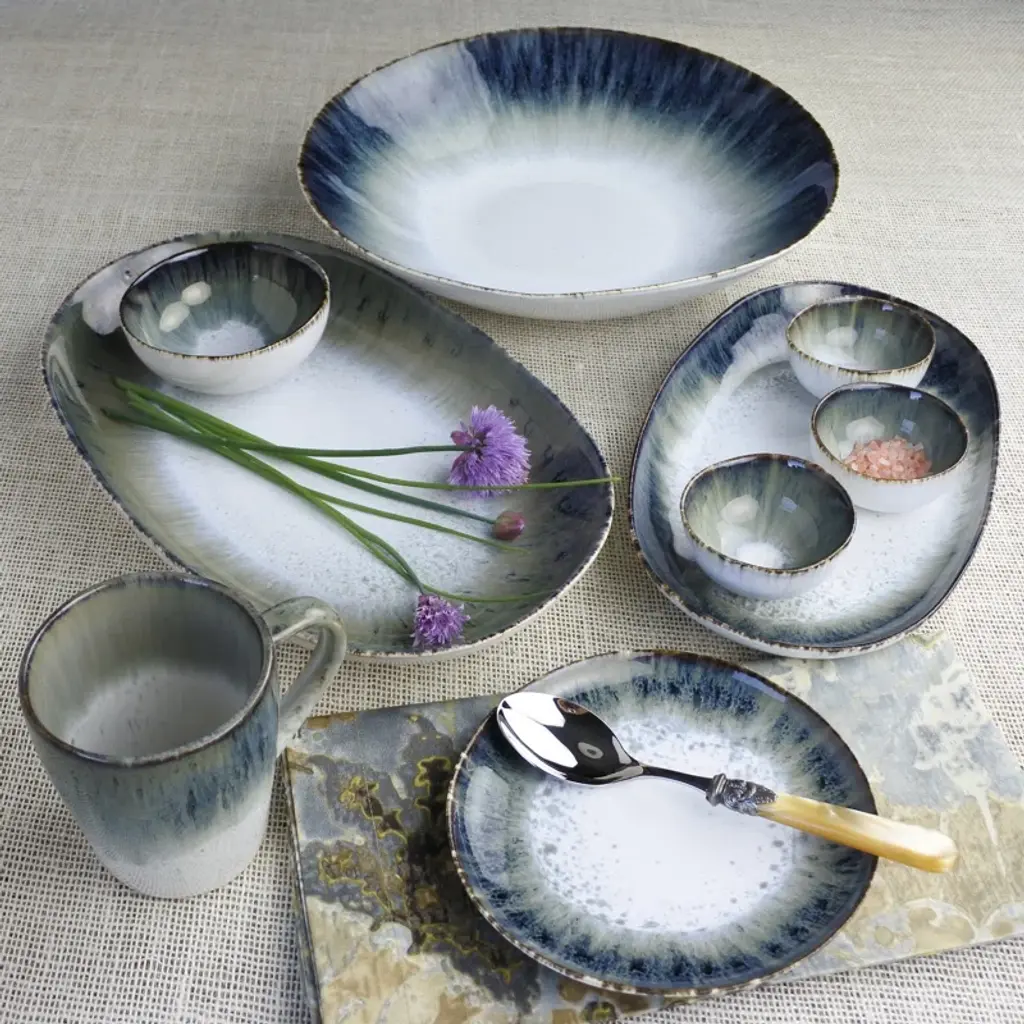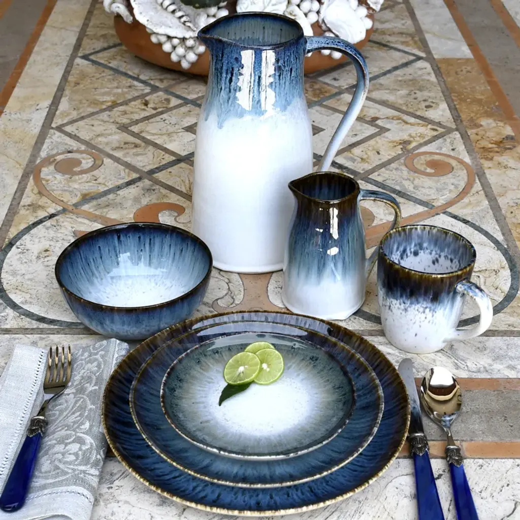 Set of 4. Whether you're staging salads or serving charcuterie, a plate like this is a great option for showing off your next mouthwatering appetizer with striking style. Crafted from stoneware, this plate features an eye-catching glaze with a white center and blue edge that darkens near the rim. This plate is microwaveable, so there's no need to worry if you're reheating a hot appetizer. And since it's dishwasher safe, cleaning up after a meal is as easy as a quick cycle.