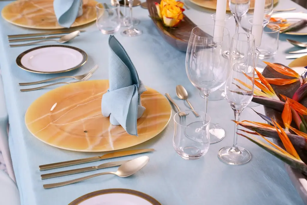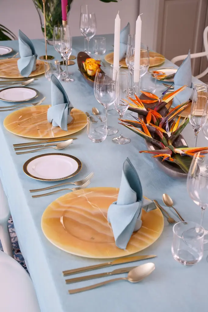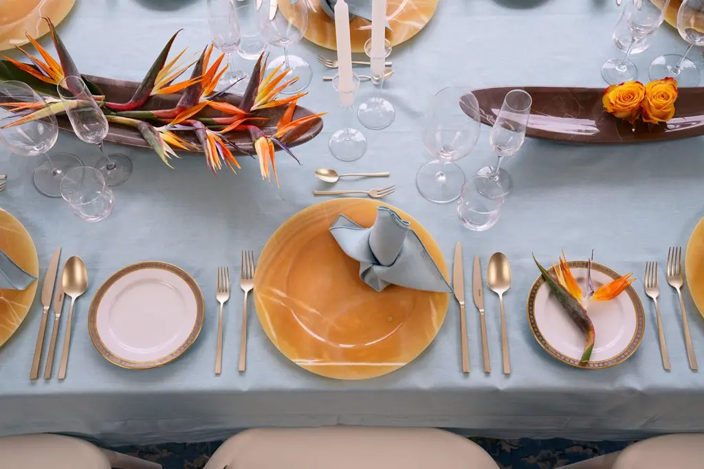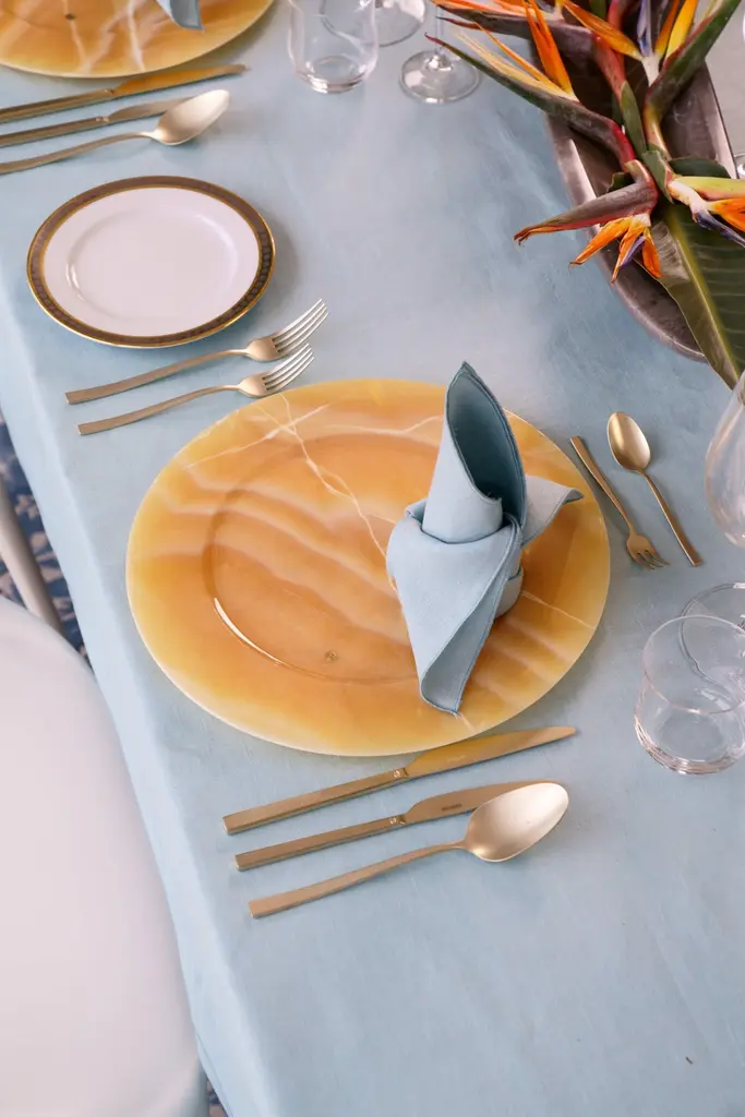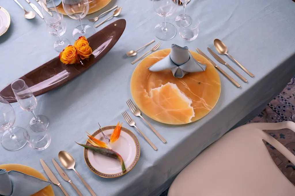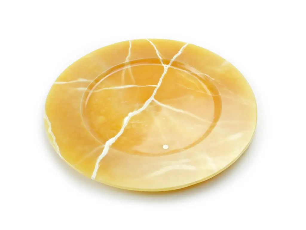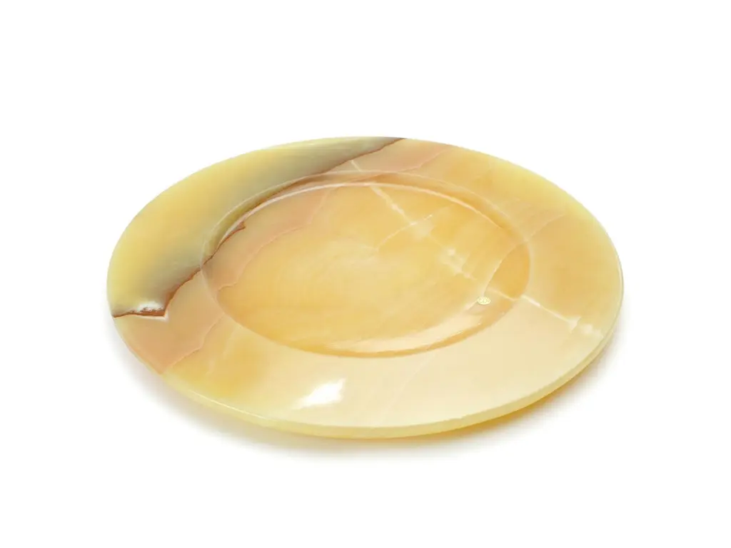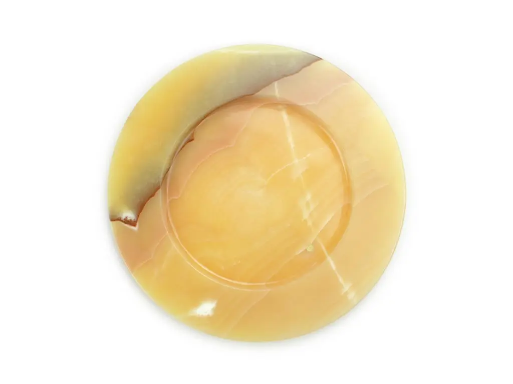 Hand carved charger plate from orange onyx. Multiple use as charger plates, plates, platters and placers. The polished finishing underlines the transparency of the onyx making this a very precious object. Dimensions: D 33, H 1.9 cm.Available in different marbles, onyx and quartzite. Onyx is a natural material, every piece is unique as each onyx block is different in veins and color shades. All of our creations are handmade by Italian artisans and can slightly vary in shape and size. This is to be considered as a guarantee of a handmade object. All Pieruga objects are made of precious and natural marbles and onyx. Marble is sensitive to acid-based liquids, especially a prolonged contact with substances such as wine, lemon, vinegar, fruit juices, cola and alcohol can stain the surface.Cleaning should be carried out with a soft sponge, water and neutral detergent. Do not use metallic or abrasive sponges, do not wash in the dishwasher, do not use in the microwave. The color of the marble after washing can undergo variations due to the humidity trapped in the surface’s micro-pores. Once fully dried it will regain its original color. The brass inlays tend to oxidize over time, to make them return to shine again use a soft cotton pad soaked in a solution of water and traditional Marseille soap, gently rub over the brass inserts and rinse the surface thoroughly. We are against the use of chemical products, all Pieruga objects are processed and polished through long manual processes without the use of polishing liquids.Pieruga proudly creates elegant accessories and complements in marble through artisanal processes, bringing into dialogue ancient techniques of sculpture with advanced technologies. 100% handmade in Italy.Our Mission is a clear Signal of opposition to the enormous waste that occurs in the extraction and processing of large blocks of marble, tons of material are discarded and thrown, in disfigurement to the generosity of our mountains.Rediscovering the ancient art of manual sculpture we give new life to even the smallest fragment of marble, bringing to light its millenary beauty that is lost in more than 2000 years of architecture and sculpture.Pieruga Marble is a new brand by Barberini & Gunnell.The Atelier Barberini & Gunnell was founded by the architects and designers Francesco Barberini and Nina A. GunnellThe artworks by Barberini & Gunnell are regularly shown at international art fairs, such as PAD London, PAD Genève, PAD Monaco, Salon Art + Design New York, Art Miami.