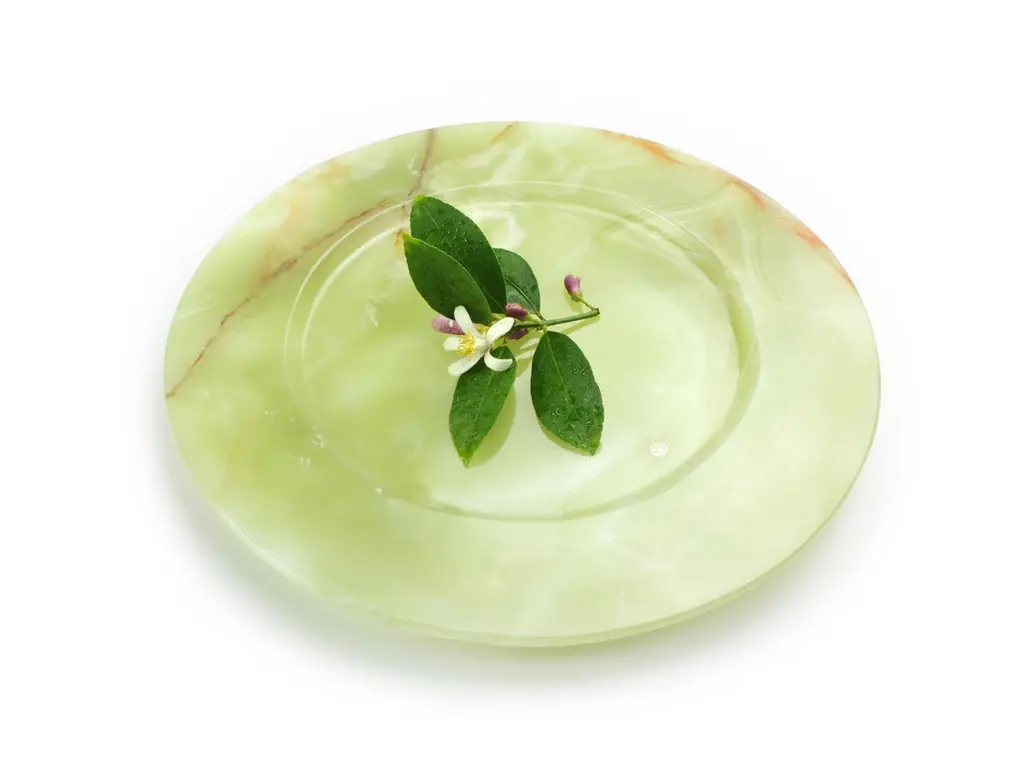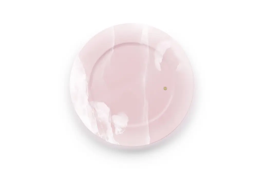Hand carved charger plate from pink onyx. Multiple use as charger plates, plates, platters and placers. The polished finishing underlines the transparency of the onyx making this a very precious object. Dimensions: D 33, H 1.9 cm. Available in different marbles, onyx and quartzite. 100% Hand made in Italy. Onyx is a natural material, every piece is unique as each onyx block is different in veins and color shades. All of our creations are handmade by Italian artisans and can slightly vary in shape and size. This is to be considered as a guarantee of a handmade object. All Pieruga objects are made of precious and natural marbles and onyx. Marble is sensitive to acid-based liquids, especially a prolonged contact with substances such as wine, lemon, vinegar, fruit juices, cola and alcohol can stain the surface.Cleaning should be carried out with a soft sponge, water and neutral detergent. Do not use metallic or abrasive sponges, do not wash in the dishwasher, do not use in the microwave. The color of the marble after washing can undergo variations due to the humidity trapped in the surface’s micro-pores. Once fully dried it will regain its original color. The brass inlays tend to oxidize over time, to make them return to shine again use a soft cotton pad soaked in a solution of water and traditional Marseille soap, gently rub over the brass inserts and rinse the surface thoroughly. We are against the use of chemical products, all Pieruga objects are processed and polished through long manual processes without the use of polishing liquids.Pieruga proudly creates elegant accessories and complements in marble through artisanal processes, bringing into dialogue ancient techniques of sculpture with advanced technologies. 100% handmade in Italy.Our mission is a clear signal of opposition to the enormous waste that occurs in the extraction and processing of large blocks of marble, tons of material are discarded and thrown, in disfigurement to the generosity of our mountains.Rediscovering the ancient art of manual sculpture we give new life to even the smallest fragment of marble, bringing to light its millenary beauty that is lost in more than 2000 years of architecture and sculpture.Pieruga marble is a new brand by Barberini & Gunnell.The Atelier Barberini & Gunnell was founded by the architects and designers Francesco Barberini and Nina A. Gunnell The artworks by Barberini & Gunnell are regularly shown at international art fairs, such as PAD London, PAD Genève, PAD Monaco, Salon Art and Design New York, Art Miami.
