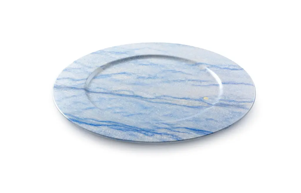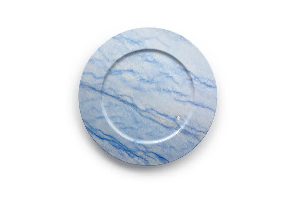 Set of 6 hand carved charger plates from semi-precious quartzite Azul Macaubas. Multiple use as charger plates, plates, platters and placers. Dimensions: D 33, H 1.9 cm. Available in different marbles, onyx and quartzite. 100% Hand made in Italy. Marble is a natural material, every piece is unique as each marble block is different in veins and color shades. All of our creations are handmade by Italian artisans and can slightly vary in shape and size. This is to be considered as a guarantee of a handmade object. All Pieruga objects are made of precious and natural marbles and onyx. Marble is sensitive to acid-based liquids, especially a prolonged contact with substances such as wine, lemon, vinegar, fruit juices, cola and alcohol can stain the surface.Cleaning should be carried out with a soft sponge, water and neutral detergent. Do not use metallic or abrasive sponges, do not wash in the dishwasher, do not use in the microwave. The color of the marble after washing can undergo variations due to the humidity trapped in the surface’s micro-pores. Once fully dried it will regain its original color. The brass inlays tend to oxidize over time, to make them return to shine again use a soft cotton pad soaked in a solution of water and traditional Marseille soap, gently rub over the brass inserts and rinse the surface thoroughly. We are against the use of chemical products, all Pieruga objects are processed and polished through long manual processes without the use of polishing liquids. Pieruga proudly creates elegant accessories and complements in marble through artisanal processes, bringing into dialogue ancient techniques of sculpture with advanced technologies. 100% handmade in Italy.Our mission is a clear signal of opposition to the enormous waste that occurs in the extraction and processing of large blocks of marble, tons of material are discarded and thrown, in disfigurement to the generosity of our mountains.Rediscovering the ancient art of manual sculpture we give new life to even the smallest fragment of marble, bringing to light its millenary beauty that is lost in more than 2000 years of architecture and sculpture.Pieruga marble is a new brand by Barberini & Gunnell.The Atelier Barberini & Gunnell was founded by the architects and designers Francesco Barberini and Nina A. Gunnell The artworks by Barberini & Gunnell are regularly shown at international art fairs, such as PAD London, PAD Genève, PAD Monaco, Salon Art and Design New York, Art Miami.