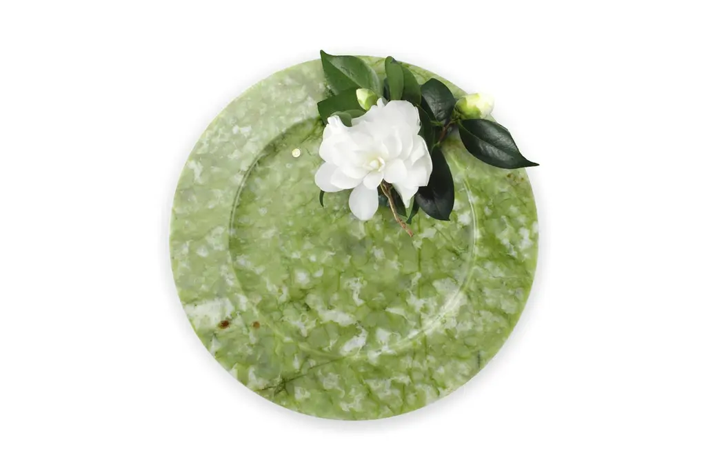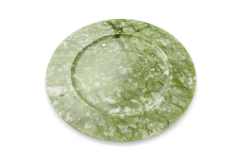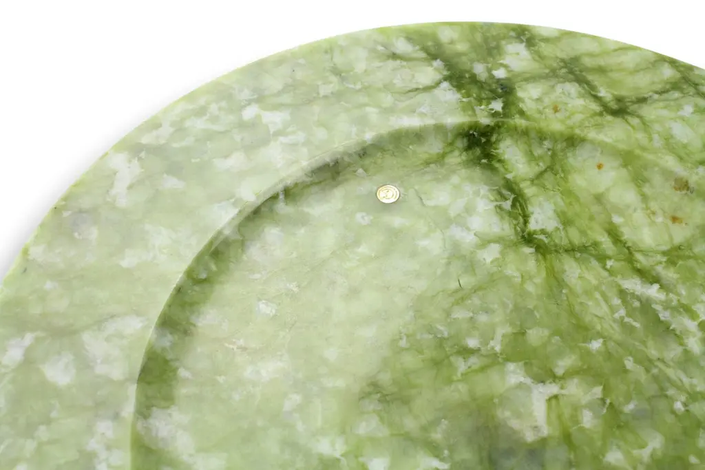 Set of 6 hand carved charger plates from Green Ming marble. Multiple use as charger plates, plates platters and placers.Dimensions: D 33 x H 1.9 cm. Available in different marbles, onyx and quartzite. 100% Hand made in Italy. Marble is a natural material, every piece is unique as each marble block is different in veins and color shades. All of our creations are handmade by Italian artisans and can slightly vary in shape and size. This is to be considered as a guarantee of a handmade object. All Pieruga objects are made of precious and natural marbles and onyx. Marble is sensitive to acid-based liquids, especially a prolonged contact with substances such as wine, lemon, vinegar, fruit juices, cola and alcohol can stain the surface.Cleaning should be carried out with a soft sponge, water and neutral detergent. Do not use metallic or abrasive sponges, do not wash in the dishwasher, do not use in the microwave. The color of the marble after washing can undergo variations due to the humidity trapped in the surface’s micro-pores. Once fully dried it will regain its original color. The brass inlays tend to oxidize over time, to make them return to shine again use a soft cotton pad soaked in a solution of water and traditional Marseille soap, gently rub over the brass inserts and rinse the surface thoroughly. We are against the use of chemical products, all Pieruga objects are processed and polished through long manual processes without the use of polishing liquids.Pieruga proudly creates elegant accessories and complements in marble through artisanal processes, bringing into dialogue ancient techniques of sculpture with advanced technologies. 100% handmade in Italy.Our Mission is a clear Signal of opposition to the enormous waste that occurs in the extraction and processing of large blocks of marble, tons of material are discarded and thrown, in disfigurement to the generosity of our mountains.Rediscovering the ancient art of manual sculpture we give new life to even the smallest fragment of marble, bringing to light its millenary beauty that is lost in more than 2000 years of architecture and sculpture.Pieruga marble is a new brand by Barberini & Gunnell.The Atelier Barberini & Gunnell was founded by the architects and designers Francesco Barberini and Nina A. Gunnell The artworks by Barberini & Gunnell are regularly shown at international art fairs, such as PAD London, PAD Genève, PAD Monaco, Salon Art and Design New York, Art Miami.