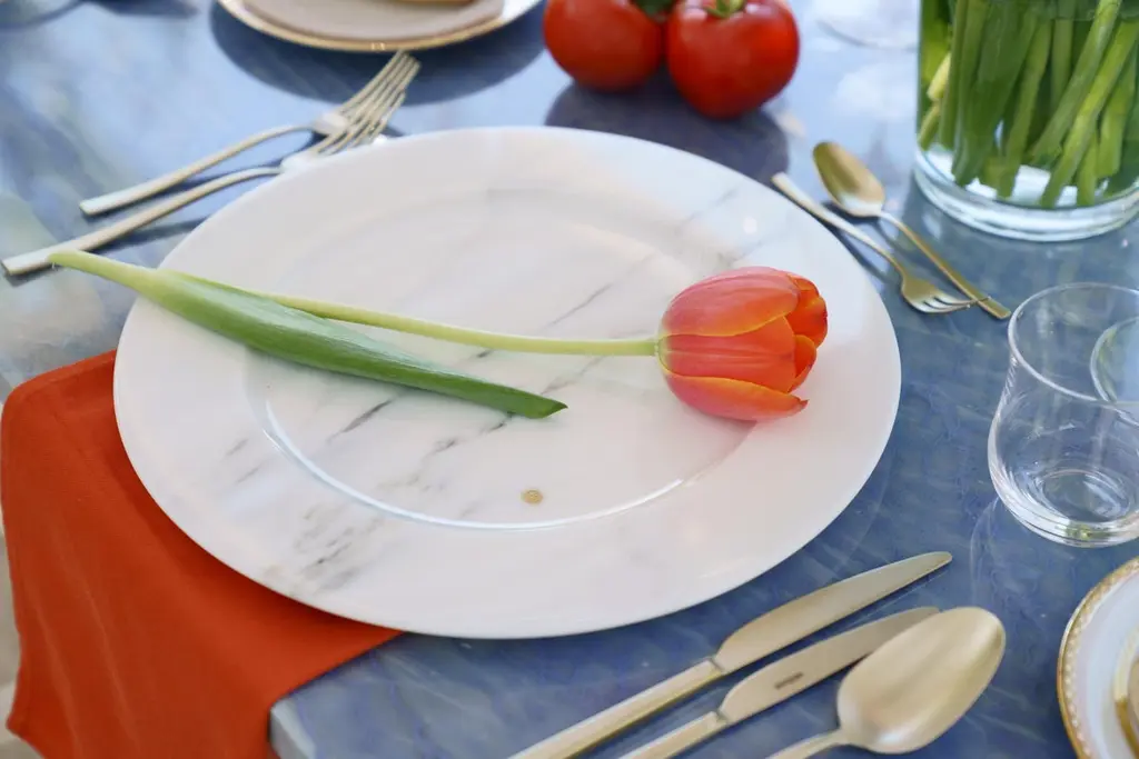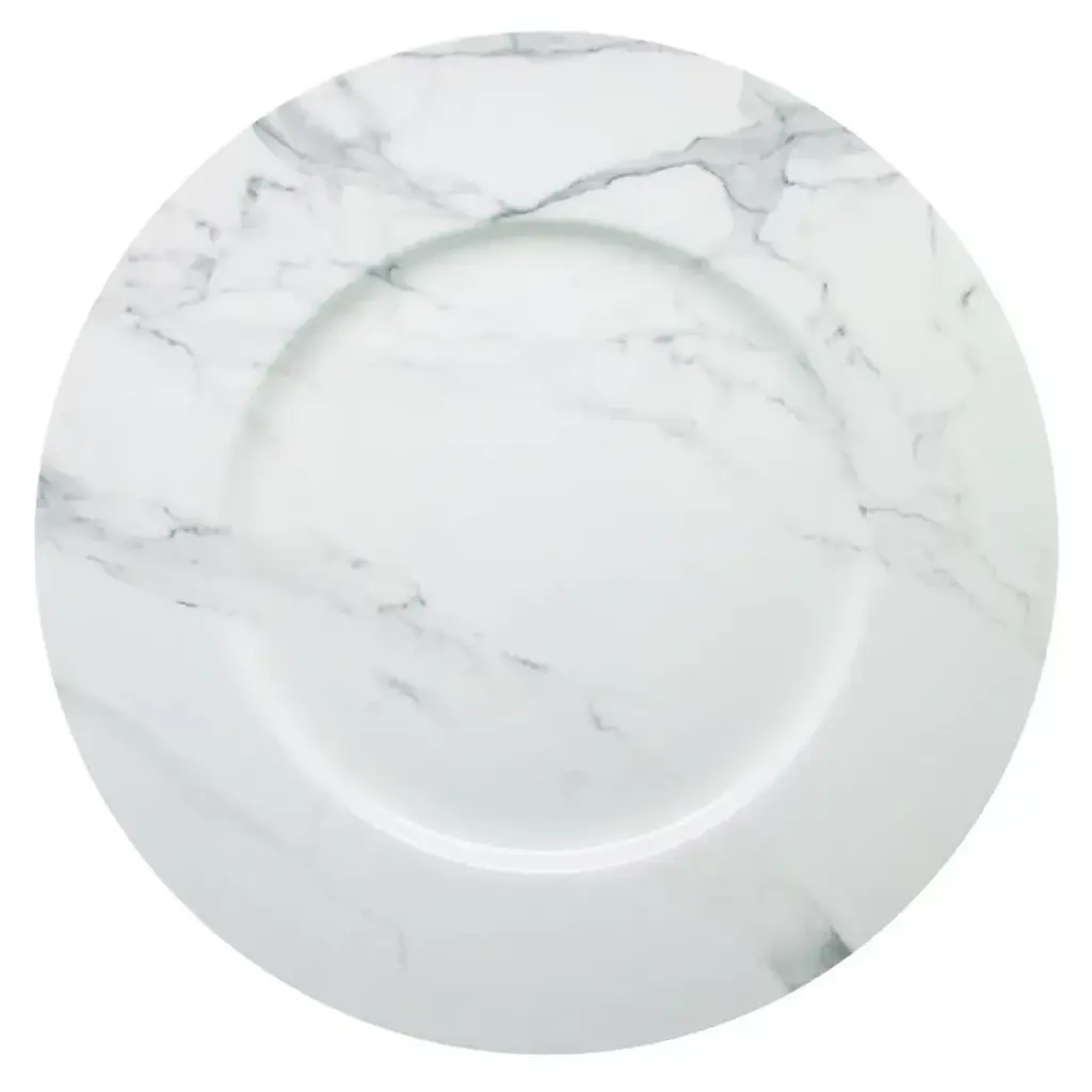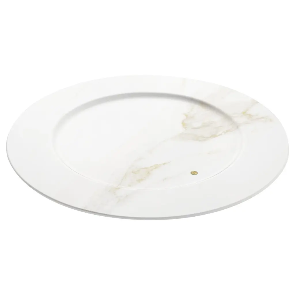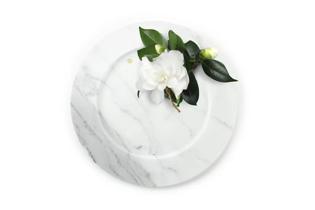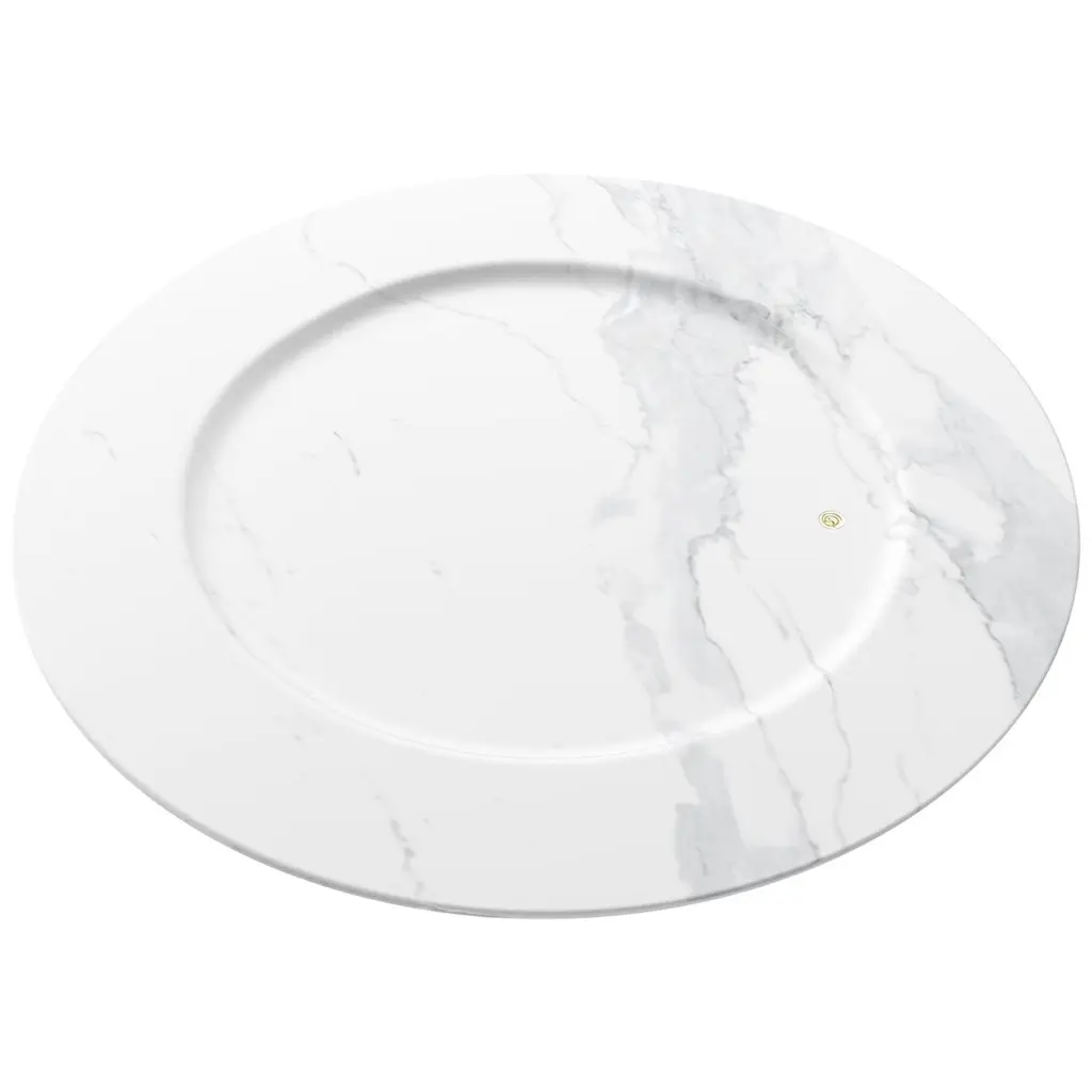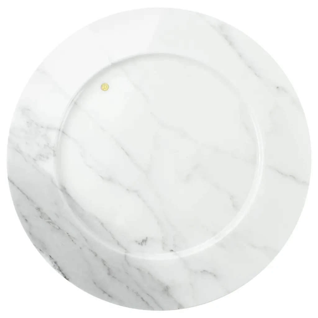 Set of 6 hand carved charger plates from Statuary marble 'Altissimo'. Multiple use as charger plates, plates, platters and placers. The precious white statuary marble has always been the one preferred by sculptors and artists for their artworks. Known throughout the world, this beautiful marble has been used since Roman times in sculptural art for its luster and compact structure, characteristics that make it perfect to be worked with a chisel.Dimensions: D 33 x H 1.9 cm.100% Handmade in Italy. Marble is a natural material, every piece is unique as each marble block is different in veins and color shades. All of our creations are handmade by Italian artisans and can slightly vary in shape and size. This is to be considered as a guarantee of a handmade object. All Pieruga objects are made of precious and natural marbles and onyx. Marble is sensitive to acid-based liquids, especially a prolonged contact with substances such as wine, lemon, vinegar, fruit juices, cola and alcohol can stain the surface.Cleaning should be carried out with a soft sponge, water and neutral detergent. Do not use metallic or abrasive sponges, do not wash in the dishwasher, do not use in the microwave. The color of the marble after washing can undergo variations due to the humidity trapped in the surface’s micro-pores. Once fully dried it will regain its original color. The brass inlays tend to oxidize over time, to make them return to shine again use a soft cotton pad soaked in a solution of water and traditional Marseille soap, gently rub over the brass inserts and rinse the surface thoroughly. We are against the use of chemical products, all Pieruga objects are processed and polished through long manual processes without the use of polishing liquids.Pieruga proudly creates elegant accessories and complements in marble through artisanal processes, bringing into dialogue ancient techniques of sculpture with advanced technologies. 100% handmade in Italy.Our Mission is a clear Signal of opposition to the enormous waste that occurs in the extraction and processing of large blocks of marble, tons of material are discarded and thrown, in disfigurement to the generosity of our mountains.Rediscovering the ancient art of manual sculpture we give new life to even the smallest fragment of marble, bringing to light its millenary beauty that is lost in more than 2000 years of architecture and sculpture.Pieruga marble is a new brand by Barberini & Gunnell.The Atelier Barberini & Gunnell was founded by the architects and designers Francesco Barberini and Nina A. Gunnell The artworks by Barberini & Gunnell are regularly shown at international art fairs, such as PAD London, PAD Genève, PAD Monaco, Salon Art and Design New York, Art Miami.