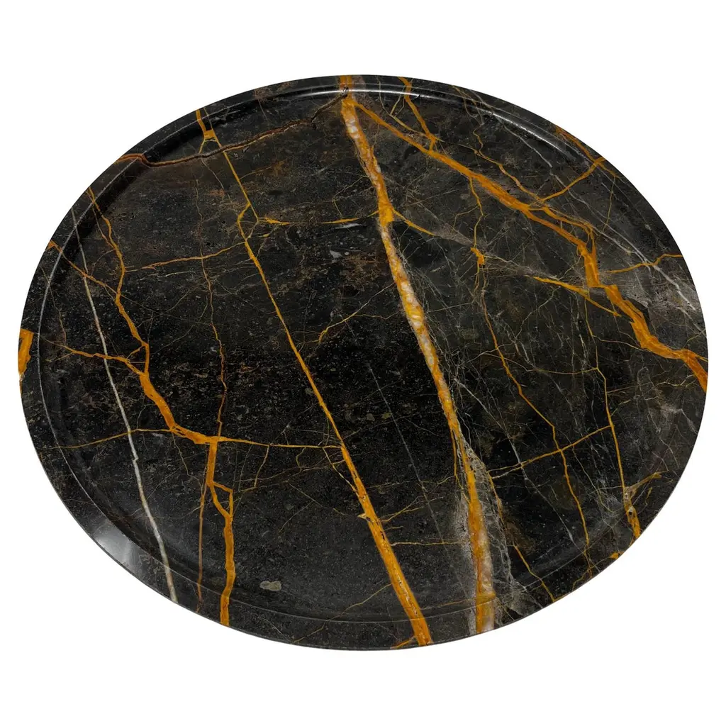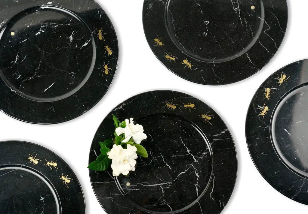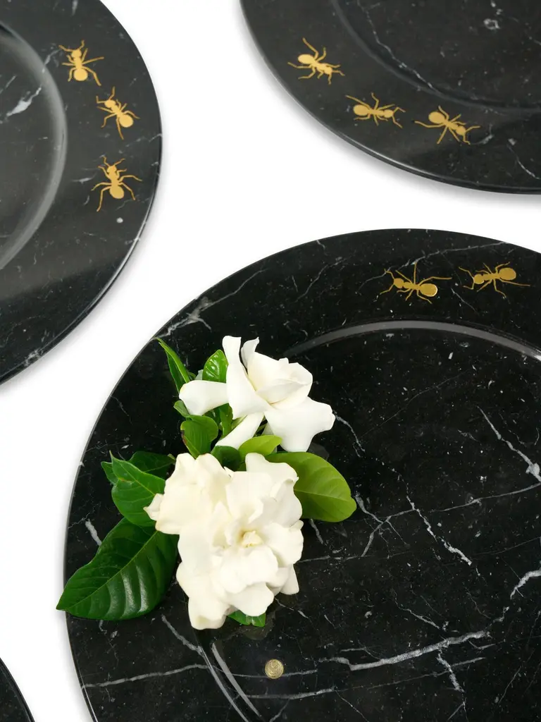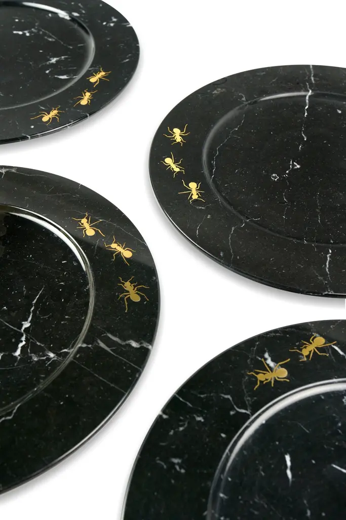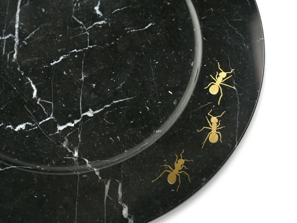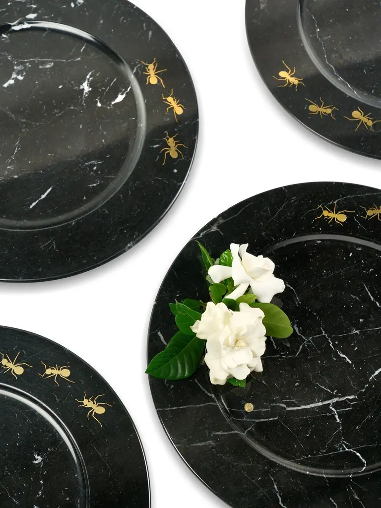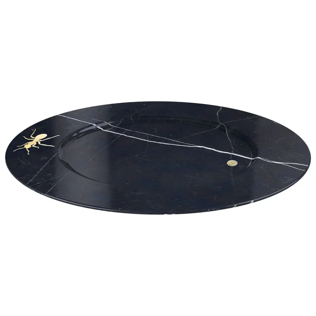 Set of 4 hand carved charger plate from black Marquina marble with 3 brass ants inlay. Multiple use as charger plates, plates, platters and placers. Dimensions: D 33, H 1.9 cm. Available in different marbles, onyx and quartzite. 100% Hand made in Italy.Marble is a natural material, every piece is unique as each marble block is different in veins and color shades. All of our creations are handmade by Italian artisans and can slightly vary in shape and size. This is to be considered as a guarantee of a handmade object. All Pieruga objects are made of precious and natural marbles and onyx. Marble is sensitive to acid-based liquids, especially a prolonged contact with substances such as wine, lemon, vinegar, fruit juices, cola and alcohol can stain the surface.Cleaning should be carried out with a soft sponge, water and neutral detergent. Do not use metallic or abrasive sponges, do not wash in the dishwasher, do not use in the microwave. The color of the marble after washing can undergo variations due to the humidity trapped in the surface’s micro-pores. Once fully dried it will regain its original color. The brass inlays tend to oxidize over time, to make them return to shine again use a soft cotton pad soaked in a solution of water and traditional Marseille soap, gently rub over the brass inserts and rinse the surface thoroughly. We are against the use of chemical products, all Pieruga objects are processed and polished through long manual processes without the use of polishing liquids.Pieruga proudly creates elegant accessories and complements in marble through artisanal processes, bringing into dialogue ancient techniques of sculpture with advanced technologies. 100% handmade in Italy.Our Mission is a clear Signal of opposition to the enormous waste that occurs in the extraction and processing of large blocks of marble, tons of material are discarded and thrown, in disfigurement to the generosity of our mountains.Rediscovering the ancient art of manual sculpture we give new life to even the smallest fragment of marble, bringing to light its millenary beauty that is lost in more than 2000 years of architecture and sculpture.Pieruga marble is a new brand by Barberini & Gunnell.The Atelier Barberini & Gunnell was founded by the architects and designers Francesco Barberini and Nina A. Gunnell The artworks by Barberini & Gunnell are regularly shown at international art fairs, such as PAD London, PAD Genève, PAD Monaco, Salon Art and Design New York, Art Miami.