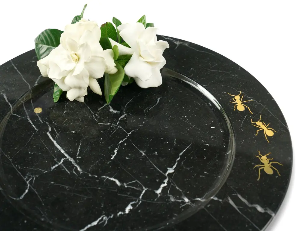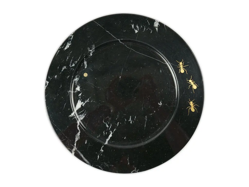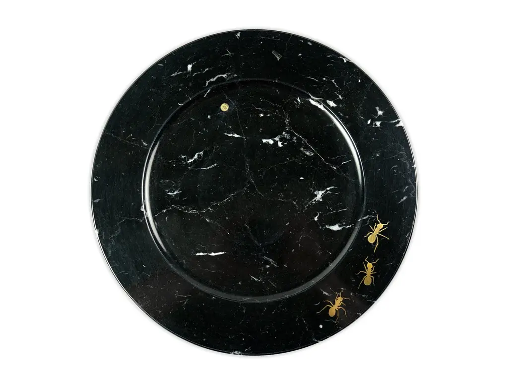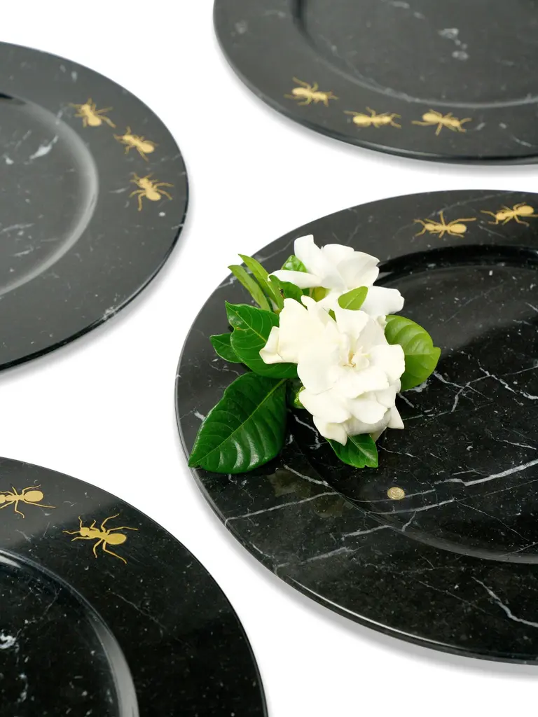Set of 6 hand carved charger plate from black Marquinia marble with 3 brass ants inlay. Multiple use as charger plates, plates, platters and placers.Dimensions: D 33 X H 1.9 cm. Available in different marbles, onyx and quartzite.100% Hand made in Italy.Marble is a natural material, every piece is unique as each marble block is different in veins and color shades. All of our creations are handmade by Italian artisans and can slightly vary in shape and size. This is to be considered as a guarantee of a handmade object. All Pieruga objects are made of precious and natural marbles and onyx. Marble is sensitive to acid-based liquids, especially a prolonged contact with substances such as wine, lemon, vinegar, fruit juices, cola and alcohol can stain the surface.Cleaning should be carried out with a soft sponge, water and neutral detergent. Do not use metallic or abrasive sponges, do not wash in the dishwasher, do not use in the microwave. The color of the marble after washing can undergo variations due to the humidity trapped in the surface’s micro-pores. Once fully dried it will regain its original color. The brass inlays tend to oxidize over time, to make them return to shine again use a soft cotton pad soaked in a solution of water and traditional Marseille soap, gently rub over the brass inserts and rinse the surface thoroughly. We are against the use of chemical products, all Pieruga objects are processed and polished through long manual processes without the use of polishing liquids.Pieruga proudly creates elegant accessories and complements in marble through artisanal processes, bringing into dialogue ancient techniques of sculpture with advanced technologies. 100% handmade in Italy.Our Mission is a clear Signal of opposition to the enormous waste that occurs in the extraction and processing of large blocks of marble, tons of material are discarded and thrown, in disfigurement to the generosity of our mountains.Rediscovering the ancient art of manual sculpture we give new life to even the smallest fragment of marble, bringing to light its millenary beauty that is lost in more than 2000 years of architecture and sculpture.Pieruga marble is a new brand by Barberini & Gunnell.The Atelier Barberini & Gunnell was founded by the architects and designers Francesco Barberini and Nina A. GunnellThe artworks by Barberini & Gunnell are regularly shown at international art fairs, such as PAD London, PAD Genève, PAD Monaco, Salon Art and Design New York, Art Miami.