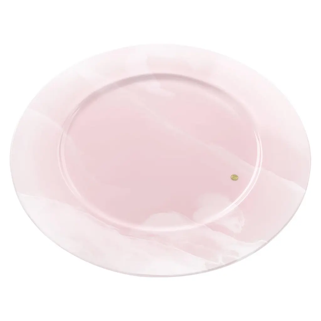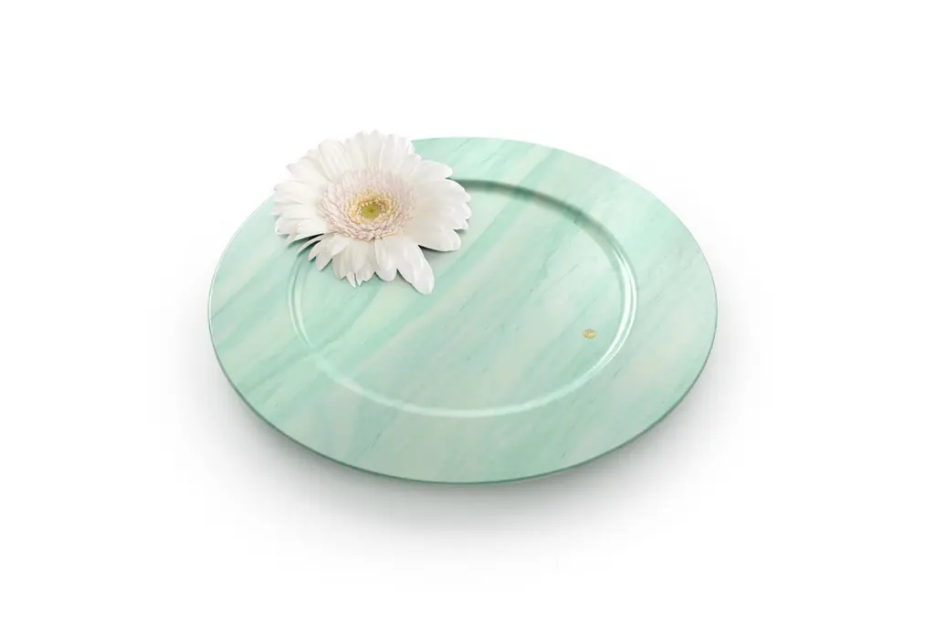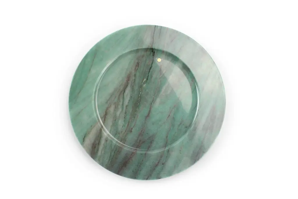 Set of 6 hand carved charger plates from semi-precious Green quartzite. Multiple use as charger plates, plates, platters and placers. Dimensions: D 33, H 1.9 cm. Available in different marbles, onyx and quartzite. 100% Hand made in Italy. Marble is a natural material, every piece is unique as each marble block is different in veins and color shades. All of our creations are handmade by Italian artisans and can slightly vary in shape and size. This is to be considered as a guarantee of a handmade object. All Pieruga objects are made of precious and natural marbles and onyx. Marble is sensitive to acid-based liquids, especially a prolonged contact with substances such as wine, lemon, vinegar, fruit juices, cola and alcohol can stain the surface.Cleaning should be carried out with a soft sponge, water and neutral detergent. Do not use metallic or abrasive sponges, do not wash in the dishwasher, do not use in the microwave. The color of the marble after washing can undergo variations due to the humidity trapped in the surface’s micro-pores. Once fully dried it will regain its original color. The brass inlays tend to oxidize over time, to make them return to shine again use a soft cotton pad soaked in a solution of water and traditional Marseille soap, gently rub over the brass inserts and rinse the surface thoroughly. We are against the use of chemical products, all Pieruga objects are processed and polished through long manual processes without the use of polishing liquids.Pieruga proudly creates elegant accessories and complements in marble through artisanal processes, bringing into dialogue ancient techniques of sculpture with advanced technologies. 100% handmade in Italy.Our Mission is a clear Signal of opposition to the enormous waste that occurs in the extraction and processing of large blocks of marble, tons of material are discarded and thrown, in disfigurement to the generosity of our mountains.Rediscovering the ancient art of manual sculpture we give new life to even the smallest fragment of marble, bringing to light its millenary beauty that is lost in more than 2000 years of architecture and sculpture.Pieruga marble is a new brand by Barberini & Gunnell.The Atelier Barberini & Gunnell was founded by the architects and designers Francesco Barberini and Nina A. Gunnell The artworks by Barberini & Gunnell are regularly shown at international art fairs, such as PAD London, PAD Genève, PAD Monaco, Salon Art and Design New York, Art Miami.