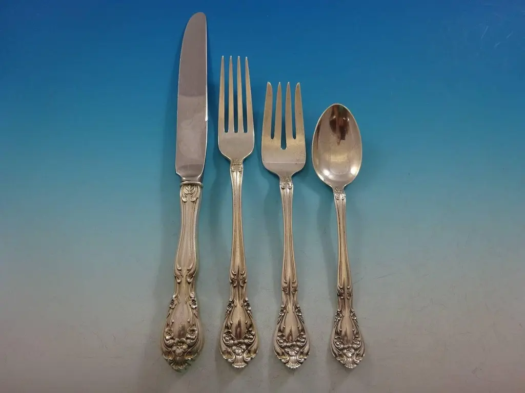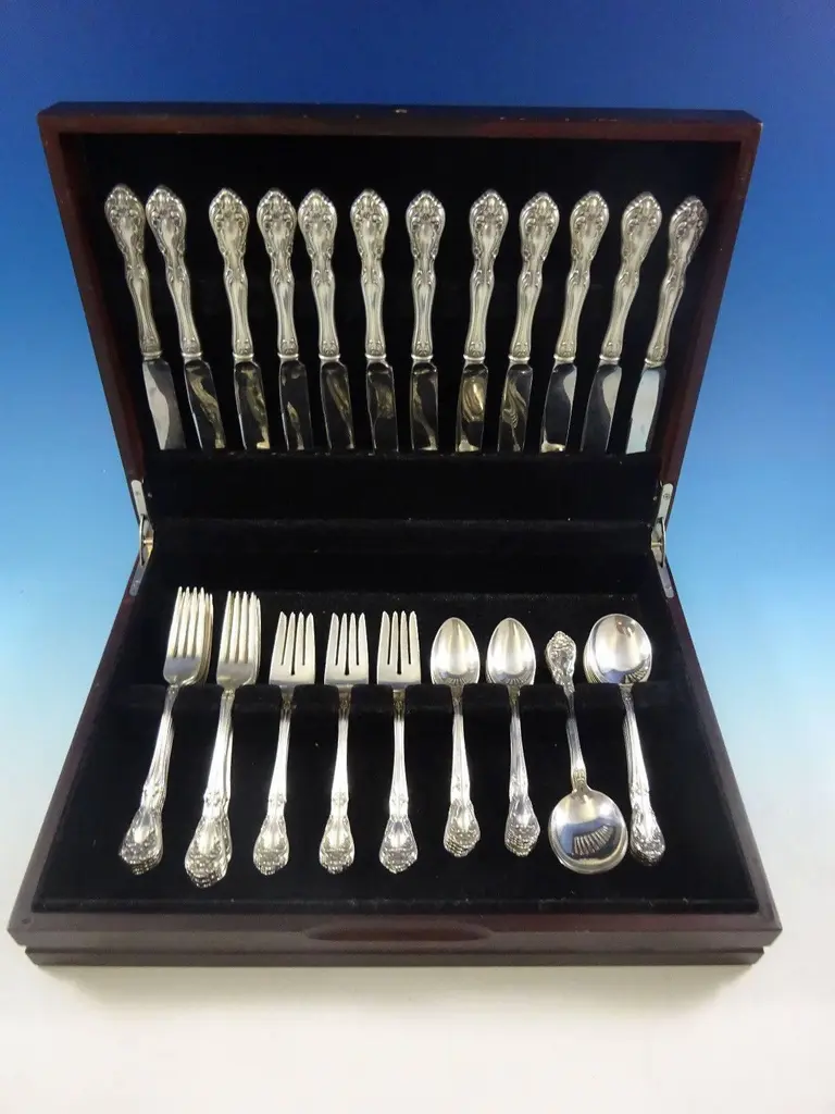 Chateau Rose by Alvin sterling silver Flatware set, 60 pieces. This set includes: 12 knives, 9", 12 forks, 7 1/8", 12 salad forks, 6 3/8", 12 teaspoons, 5 7/8", 12 cream soup spoons, 6 1/8"Includes bonus brand new storage chest - styles vary.Excellent condition, with no monograms. This set will be beautifully professionally polished prior to shipping. 100% Satisfaction guaranteed!We buy silver. Please inquire.