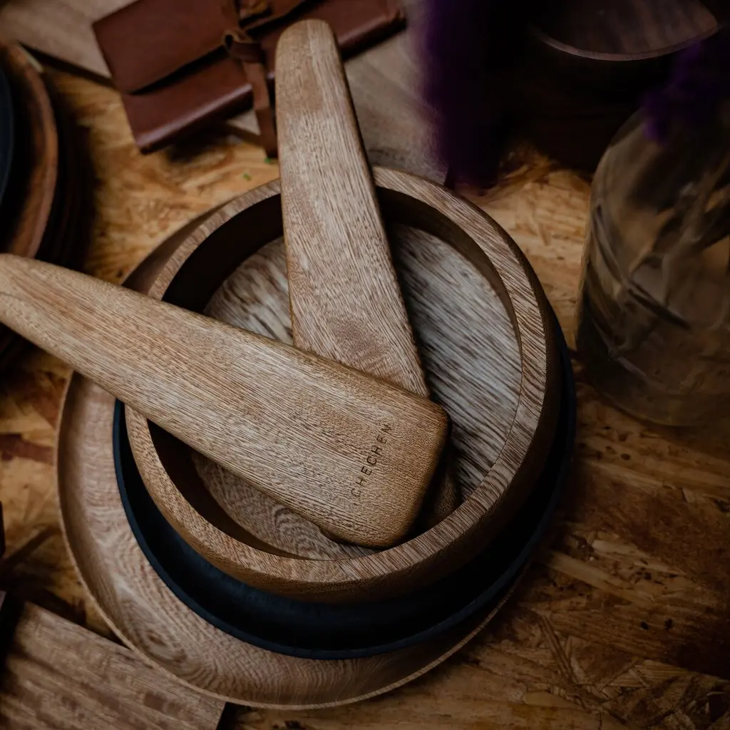 100% Rosa Morada wooden salad servers to complement your kitchen setting. Each piece is a creation of precision and skill, thoughtfully designed and handcrafted just for you! Siblings Maria and Santiago named Chechen Wood Design after the Chechén tree, which lives to more than 100 years old. Their strategy for the brand is just as lasting—breathing new life into wood offcuts from a furniture workshop, which are too small for furniture, but just the right size for handmade dishes and tabletop accessories. Master carpenters in Guadalajara now combine Mexican artisanal techniques with nine different kinds of wood to create beautiful, sustainable pieces. For a dining room that’s feeling a little meh, try the zebra board crafted from Rosa Morada and Tzalam woods—it’s a perfect platter for charcuterie. Pair it with the Cumaru wood knife, ideal for cutting hard cheeses. Thanks to Chechen Wood Design’s precision, skill and artistry, these pieces will live a hundred years—just like their namesake tree.