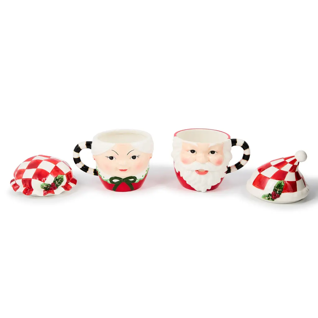 Add MacKenzie-Childs signature charm to your Christmas season with these lidded Check It Out Mr. and Mrs. Claus Mugs. Sporting red checked caps, you can keep your cup of cocoa nice and hot while you idle hours away in front of the fireplace, or use the mugs to hold your favorite holiday treats.