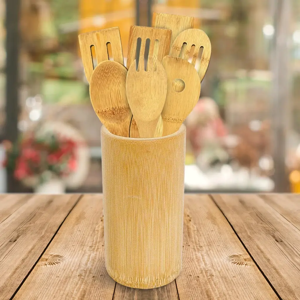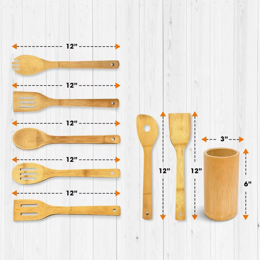 Upgrade your kitchen essentials with this 8-piece Bamboo Cooking Utensil Set, designed for style, safety, and everyday functionality. Each utensil measures 12 inches long and is crafted from natural bamboo, offering a lightweight yet durable solution for stirring, flipping, and serving without damaging your cookware. The set includes a variety of spoons and turners, plus a sleek cup holder (6"H x 3"W x 3"D) to keep your tools neatly stored and within reach. With a smooth, splinter-free finish and ergonomic grip, these utensils are comfortable to use and naturally resistant to heat and moisture. Ideal for nonstick surfaces, they’re food-safe, BPA-free, and chemical-free—perfect for modern kitchens. Whether you're a home chef or gifting a new homeowner, this set adds both function and flair to any cooking space