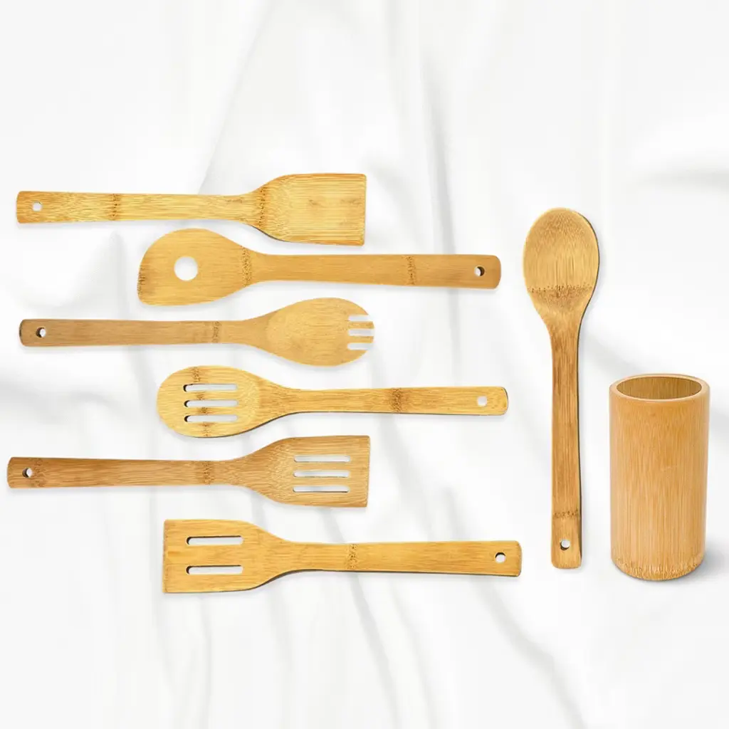Cheer Collection 8Pc Bamboo Cooking Utensils Set With Holder – Natural Wooden Spoons And Spatulas For Nonstick Pans