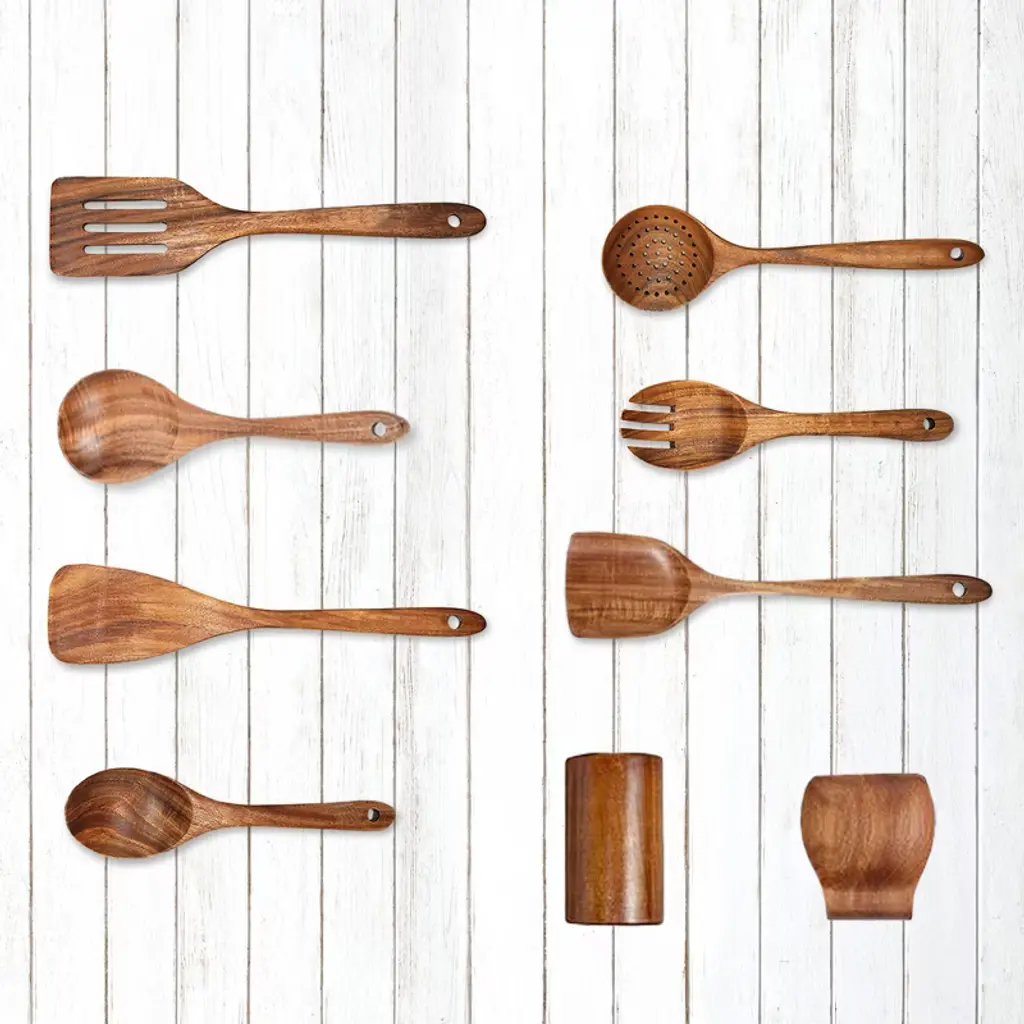 Cheer Collection 9 Piece Deluxe Wooden Utensils Set With Holder And Spoon Rest