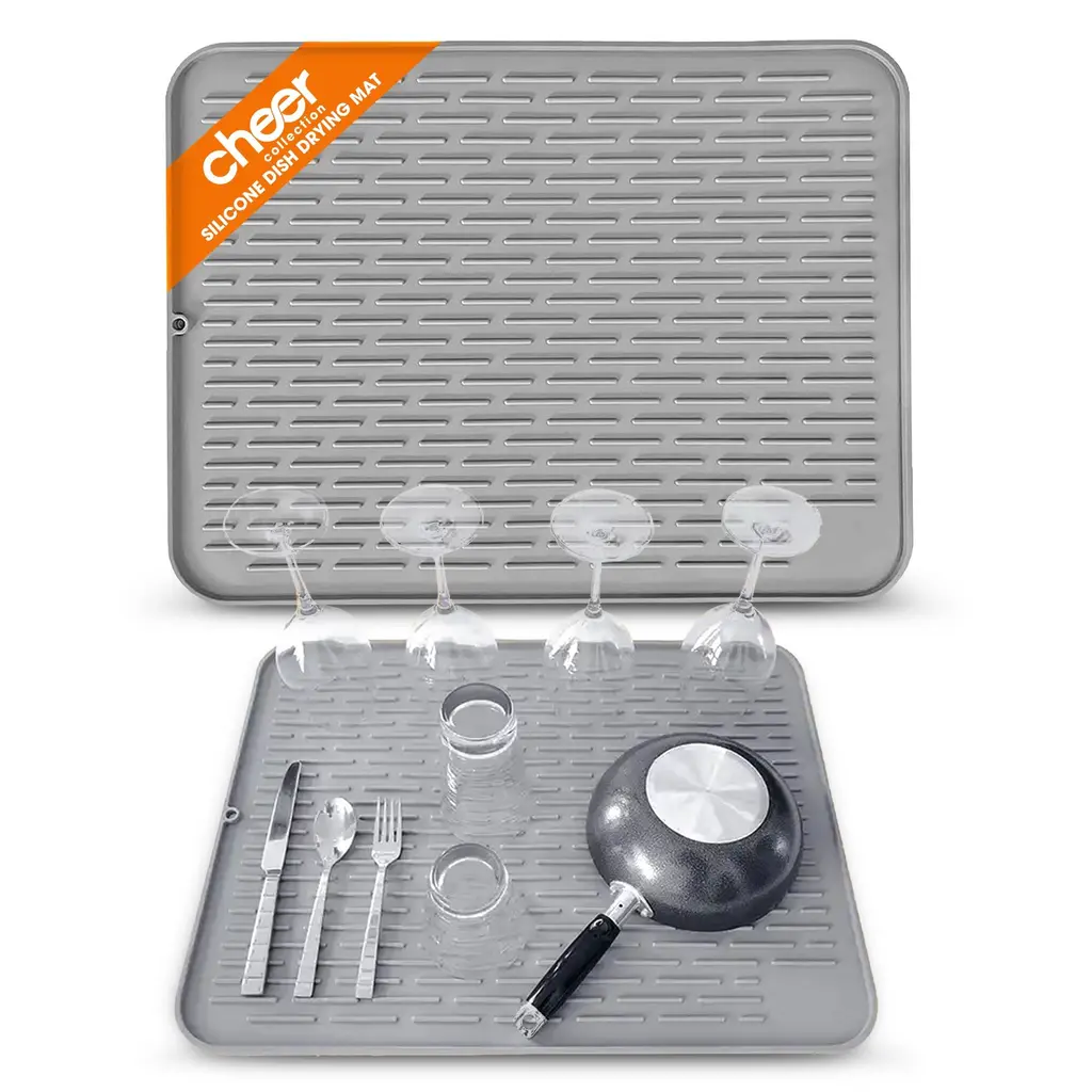 Keep Your Kitchen Counters Dry, Clean & Tidy With the Cheer Collection Silicone Dish Drying Mat! Our silicone mats for kitchen counter are waterproof, dishwasher safe, heat resistant, safe to use, easy to clean, and provide the perfect fit for any home kitchen along with offering ample storage space to make your time in the kitchen easier and simpler.Thanks to the raised edges, the drying mats for countertop help your dishes and cups dry faster while the elevated sides help prevent water from getting on your counter. Features You’ll Love: