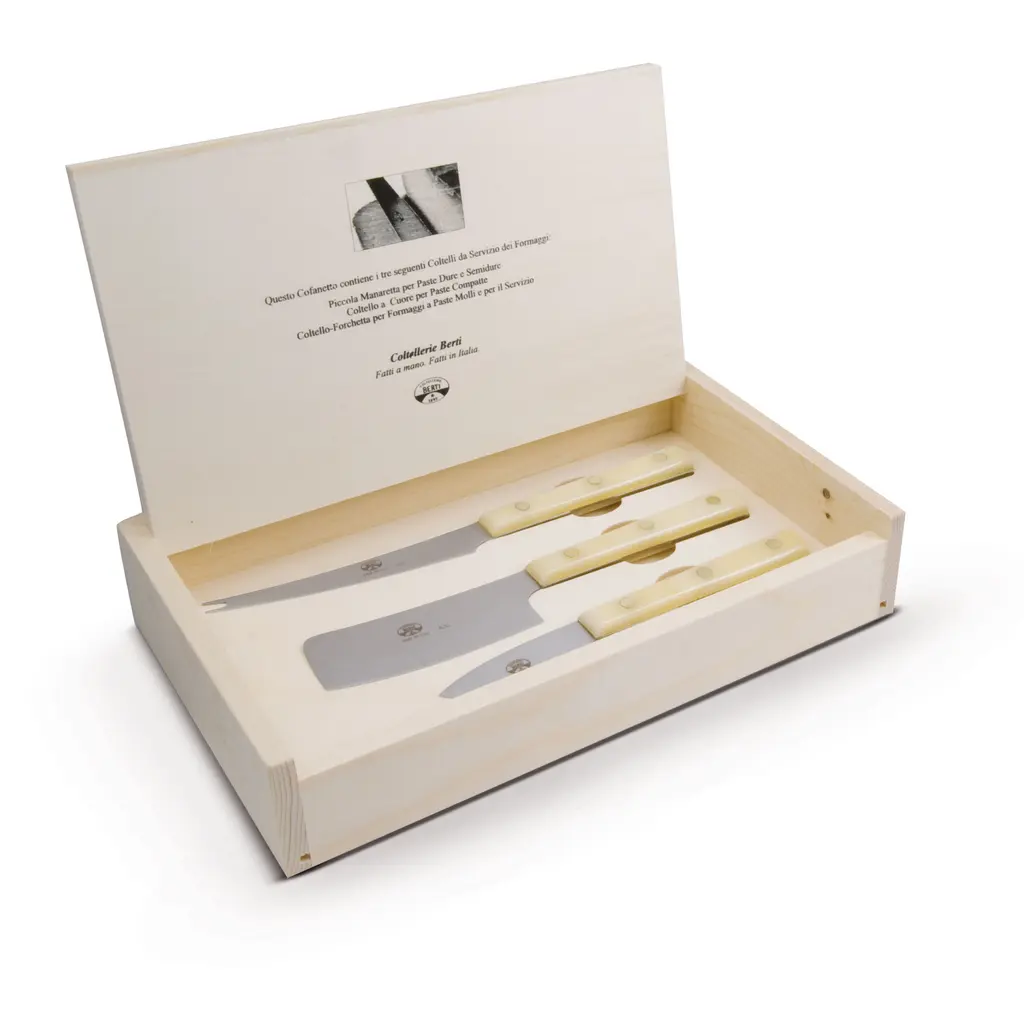 The Cheese Ceremony Knife Set includes three essential knives, each designed for slicing various types of cheese. This specialization enhances not just the visual appeal but also the flavor experience, acknowledging that cheese tastes differently from the center to the rind. Proper cutting tools, tailored to the diverse textures, sizes, and shapes of Italy’s vast cheese varieties, are crucial for optimal enjoyment. The set comes in a wooden gift box, ideal for storing the knives separately and visibly, ensuring they don’t get mixed with other utensils. Additionally, the box serves as a stylish decorative piece in the kitchen.