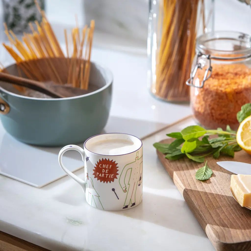 Translating the chaos of a professional kitchen into a colorful party, the Richard Brendon Chef de Partie Mug will brighten your mood every time you want to enjoy some coffee or tea. A wonderful gift for chefs and anyone who loves cooking, this mug is also ideal for everyday use. The vibrant and fun Max Machen design will ensure that this mug will always stay on display in the kitchen and ready to use. Made by hand by skilled craftspeople, the Richard Brendon Chef de Partie Mug features a screen-printed illustration and a hand-painted rim. Microwave-safe, this mug is also dishwasher-safe at up to 60°C/140°F.