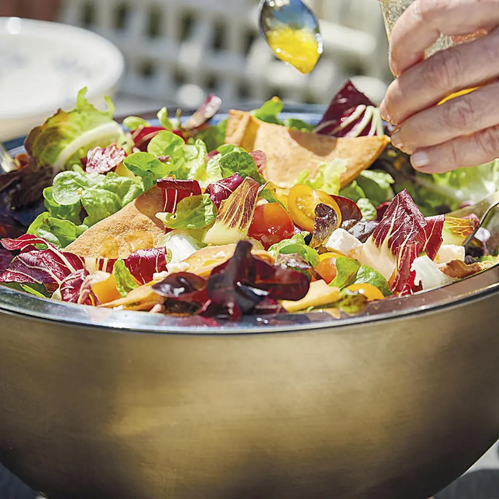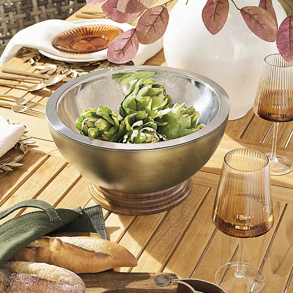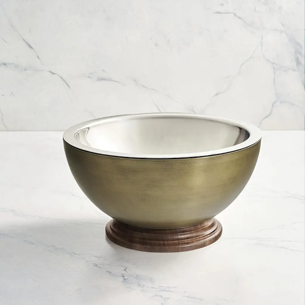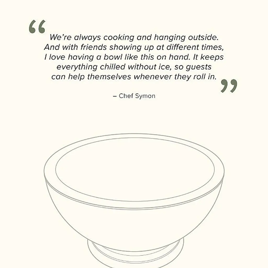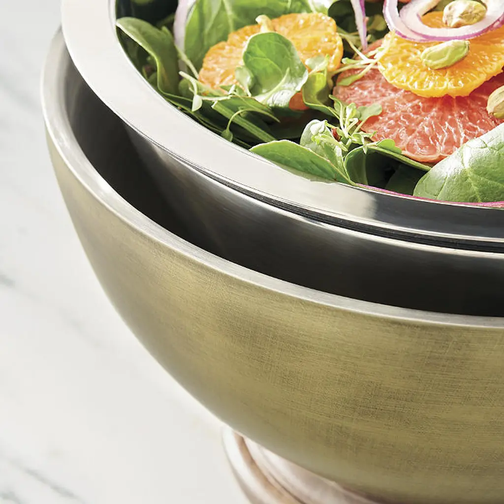 Beautifully crafted with a burnished brass finish and walnut-finished wood pedestal base inspired by Chef Symon’s signature style, this insulated serving bowl is designed to keep your food perfectly chilled for several hours without ice or condensation. It’s the perfect addition to any indoor or outdoor buffet. Double-walled 18/8 stainless steel provides maximum cold retention Gel-based inner layer freezes like ice and holds its temperature Walnut-finished wood pedestal base for added stability and style Burnished brass finish Won't leave messy water rings on tabletops or fine furnishings After handwashing, please ensure that both the outer bowl and inner bowls are completely dry before reassembly Place in a freezer prior to use Outdoor or indoor use A Frontgate exclusive. At Frontgate, our primary focus is quality. We guarantee that every product we sell will stand up to the supreme test – our customers' satisfaction. To learn more about our policies, visit our Shipping & Processing, Returns & Exchanges and Warranty & Price Guarantee pages. Beautifully crafted with a burnished brass finish and walnut-finished wood pedestal base inspired by Chef Symon’s signature style, this insulated serving bowl is designed to keep your food perfectly chilled for several hours without ice or condensation. It’s the perfect addition to any indoor or outdoor buffet. Double-walled 18/8 stainless steel provides maximum cold retention Gel-based inner layer freezes like ice and holds its temperature Walnut-finished wood pedestal base for added stability and style Burnished brass finish Won't leave messy water rings on tabletops or fine furnishings After handwashing, please ensure that both the outer bowl and inner bowls are completely dry before reassembly Place in a freezer prior to use Outdoor or indoor use A Frontgate exclusive. At Frontgate, our primary focus is quality. We guarantee that every product we sell will stand up to the supreme test – our customers' satisfaction. To learn more about our policies, visit our Shipping & Processing, Returns & Exchanges and Warranty & Price Guarantee pages.