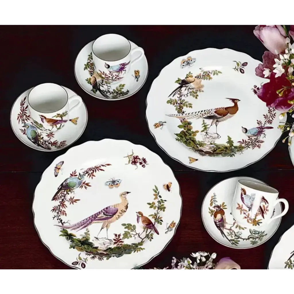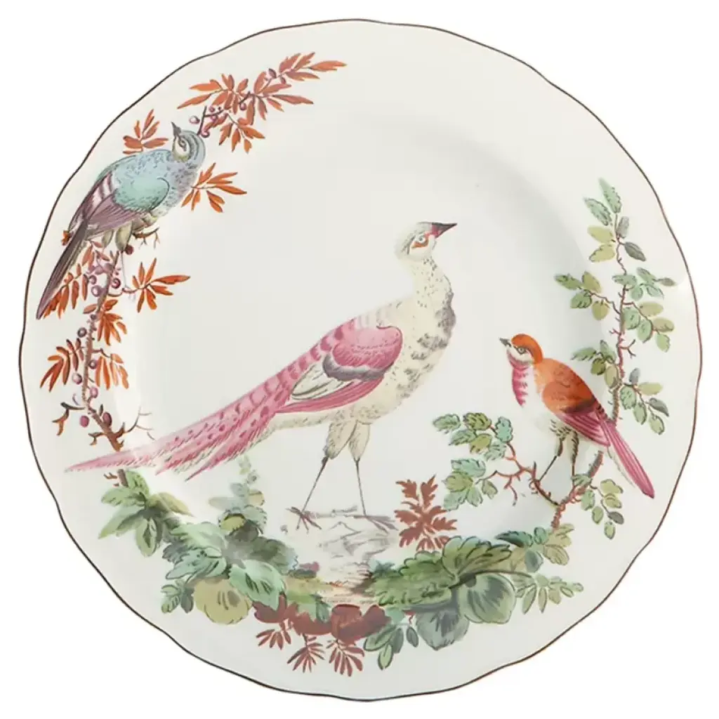 An exotic bird, reproduced from the original James Giles' "disheveled birds" platter decorates this large useful platter. An exact reproduction. A favorite with brides, Mottahedeh specializes in luxurious patterns and unique, elegant shapes that are reproduced from china found in museums and historical societies. The patterns feature complex and vibrant colors, and hand-painted gold decoration. The pieces are surprisingly fresh and timely, and look wonderful in both contemporary and traditional dining rooms.