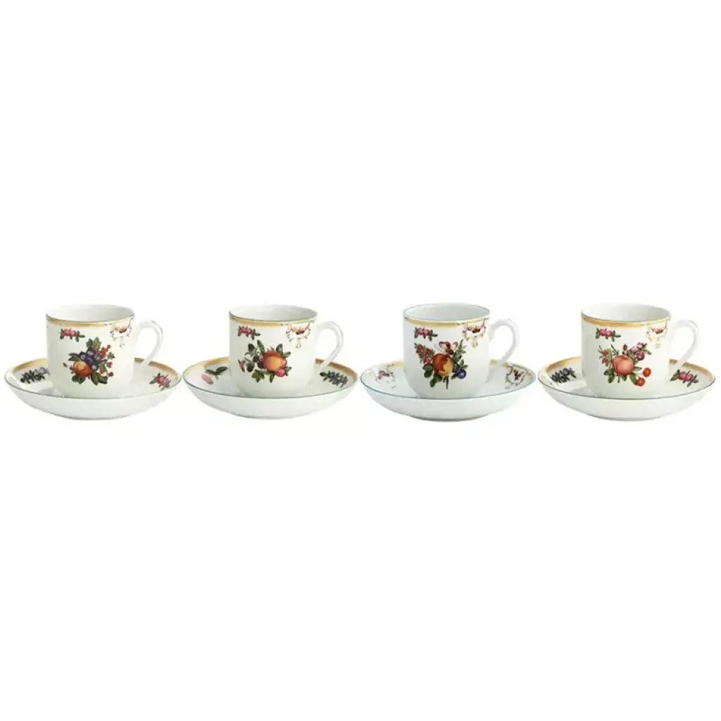 James Giles' designs have been adapted for these cups and saucers. A favorite with brides, Mottahedeh specializes in luxurious patterns and unique, elegant shapes that are reproduced from china found in museums and historical societies. The patterns feature complex and vibrant colors, and hand-painted gold decoration. The pieces are surprisingly fresh and timely, and look wonderful in both contemporary and traditional dining rooms.
