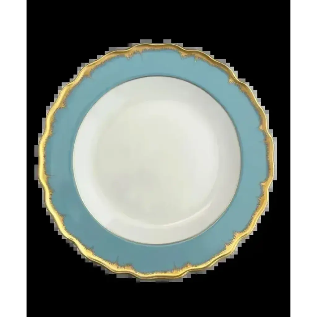 This classic turquoise dinnerware has a beautiful scalloped edge and 22 carat gold feathering with a handpainted edge. The original antique shape was produced by the Royal Worcester Manufactury for the Duke of Gloucester, an honorific title given to the younger brother, William Henry, of King George III of England. A favorite with brides, Mottahedeh specializes in luxurious patterns and unique, elegant shapes that are reproduced from china found in museums and historical societies. The patterns feature complex and vibrant colors, and hand-painted gold decoration. The pieces are surprisingly fresh and timely, and look wonderful in both contemporary and traditional dining rooms.