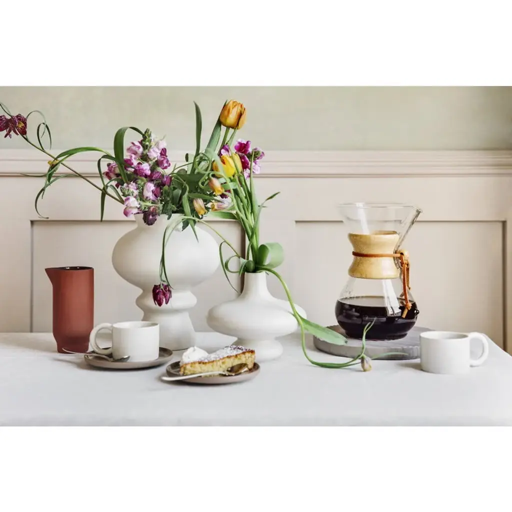 The beautiful Chemex coffee maker brews 6 cups of coffee in one go. All you need is your favorite coffee blend, hot water and a Chemex filter. Peter Schlumbom designed the Chemex coffee maker, known for its timeless and beautiful design, in 1941. Chemex was selected as one of the best-designed items of modern times in 1956 by Illinois Institute of Technology, and it belongs to the permanent collections of renowned museums including MoMA and the Smithsonian. Schlumbohm, who had a doctorate in chemistry, took his inspiration from the shape and qualities of laboratory equipment, especially those of the funnel and the Erlenmeyer flask. To the “funnel” he added an air channel and a pouring spout and to the “flask” a small protrusion to mark the midpoint. Chemex is made of borosilicate glass that does not absorb odors or chemical residue. The wooden handle with a leather strap is a functional and eye-pleasing detail. Chemex is an ideal choice for minimalists and coffee aficionados alike.